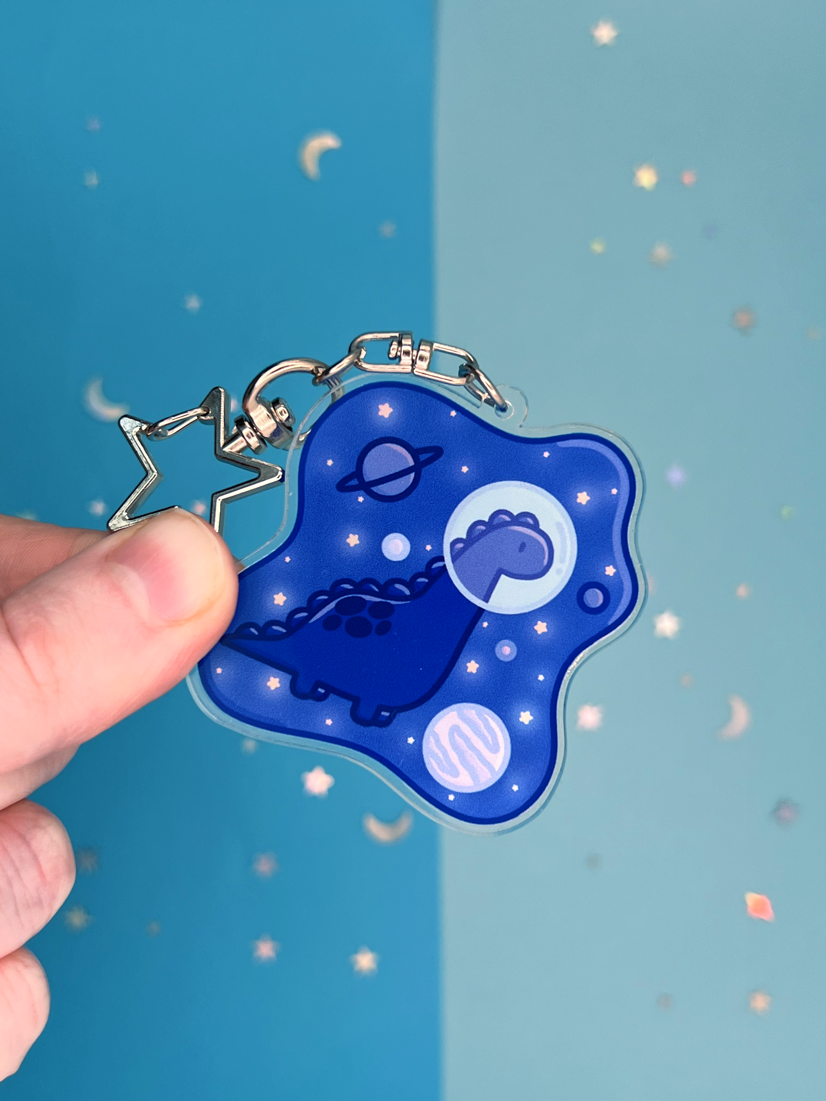 Each keyring is made from durable acrylic with an adorable space themed dinosaur design printed on one side. The star shaped metal clasp ensures secure attachment to keys, bags, or anywhere you want to add your new dino friend! Our Space Dinos Keyring is perfect for whether you're a dinosaur enthusiast or simply love adding a dash of personality to your accessories! 🦕✨