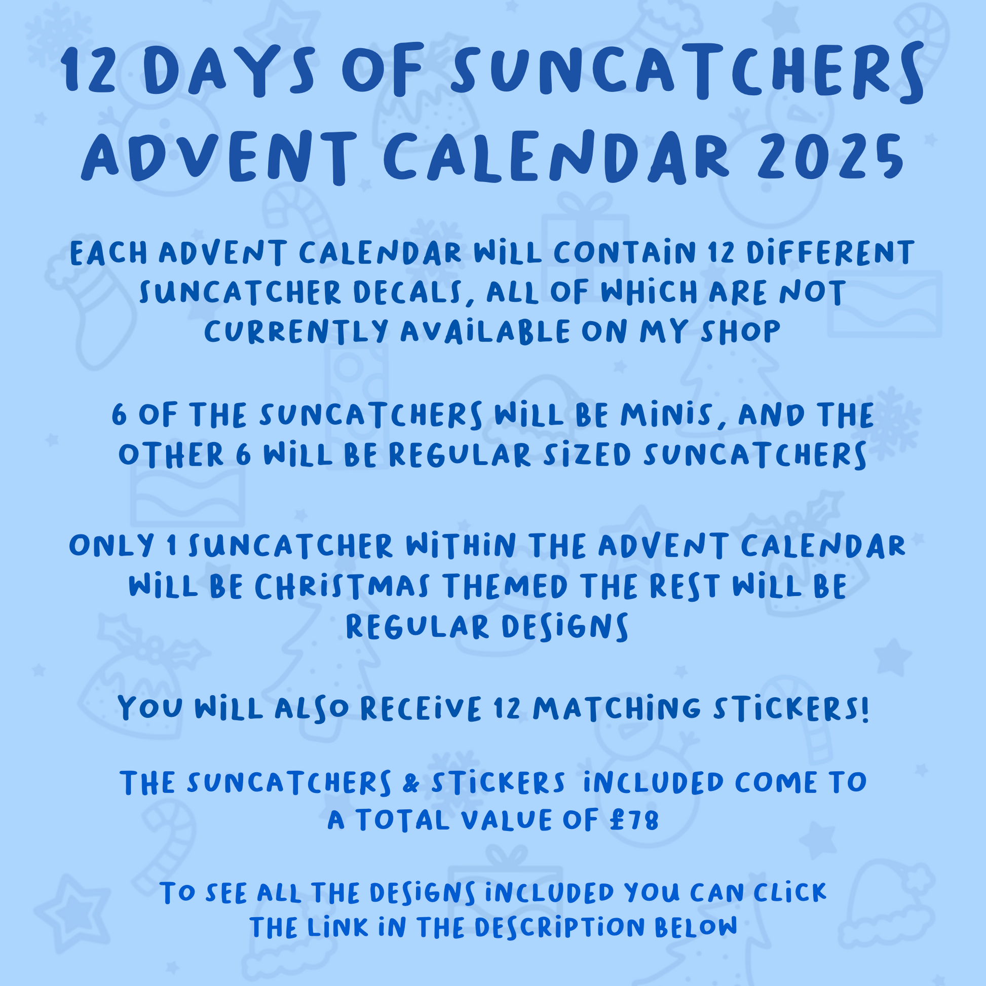 This advent calendar will contain 12 new suncatchers all of which are not currently available on my shop individually. There will be 6 regular sized suncatchers and 6 minis. Only one of the suncatchers in these advent calendars will be Christmas themed.