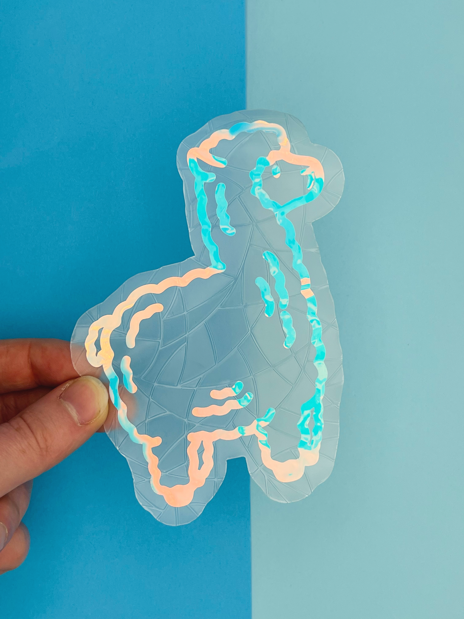 Each suncatcher has a holographic alpaca over the top of the background shape.