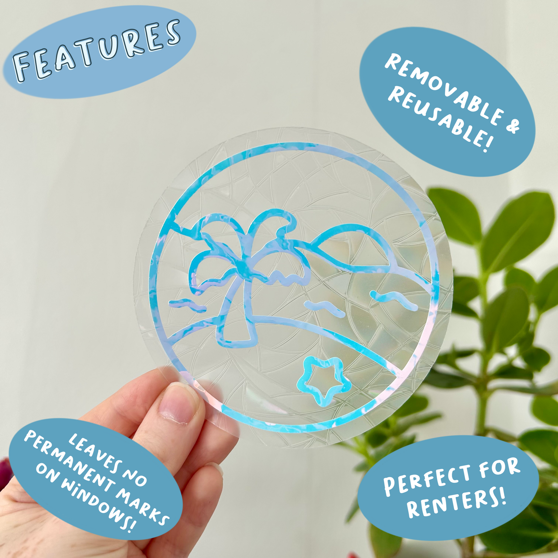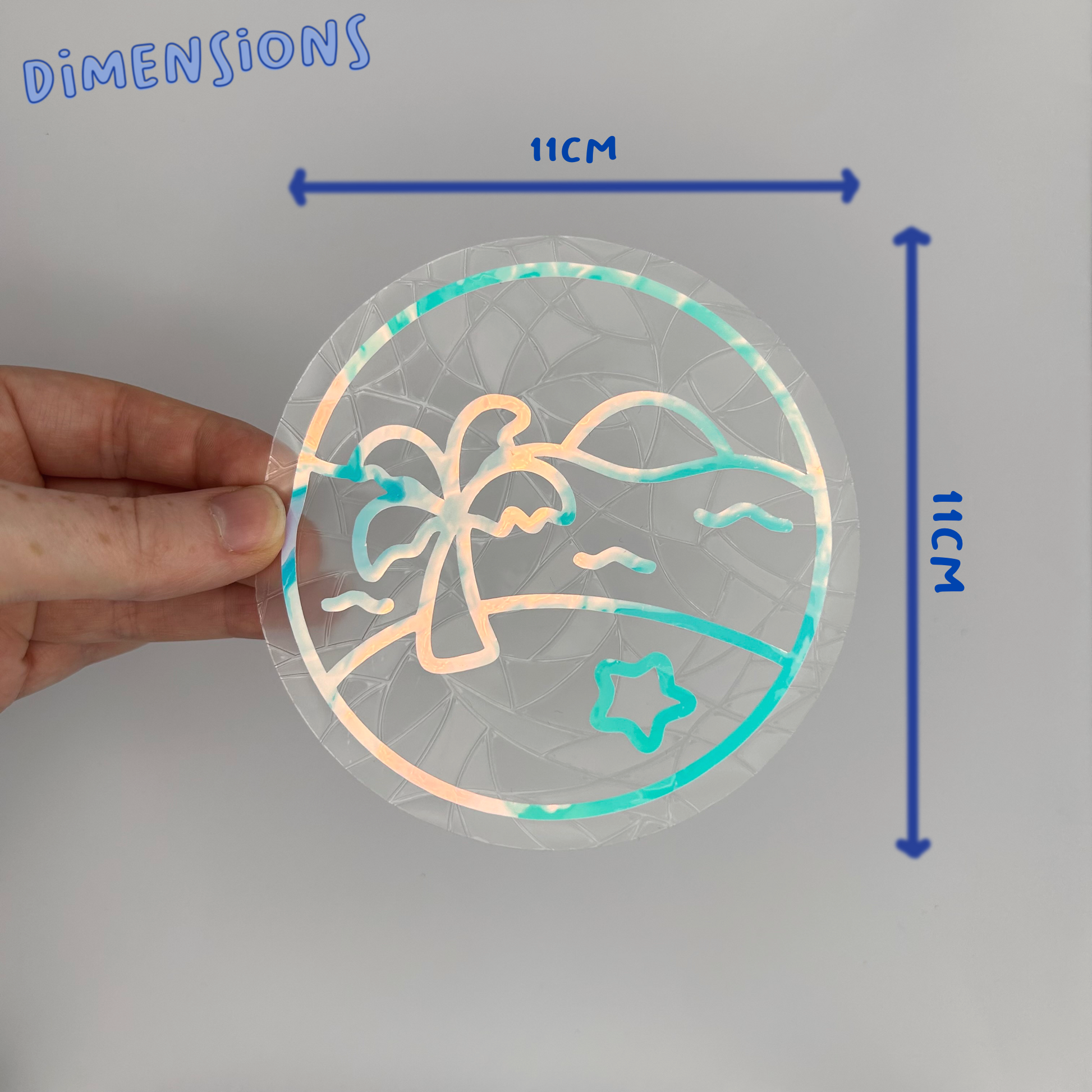 Each suncatcher has a holographic beach scene over the top of the background shape.