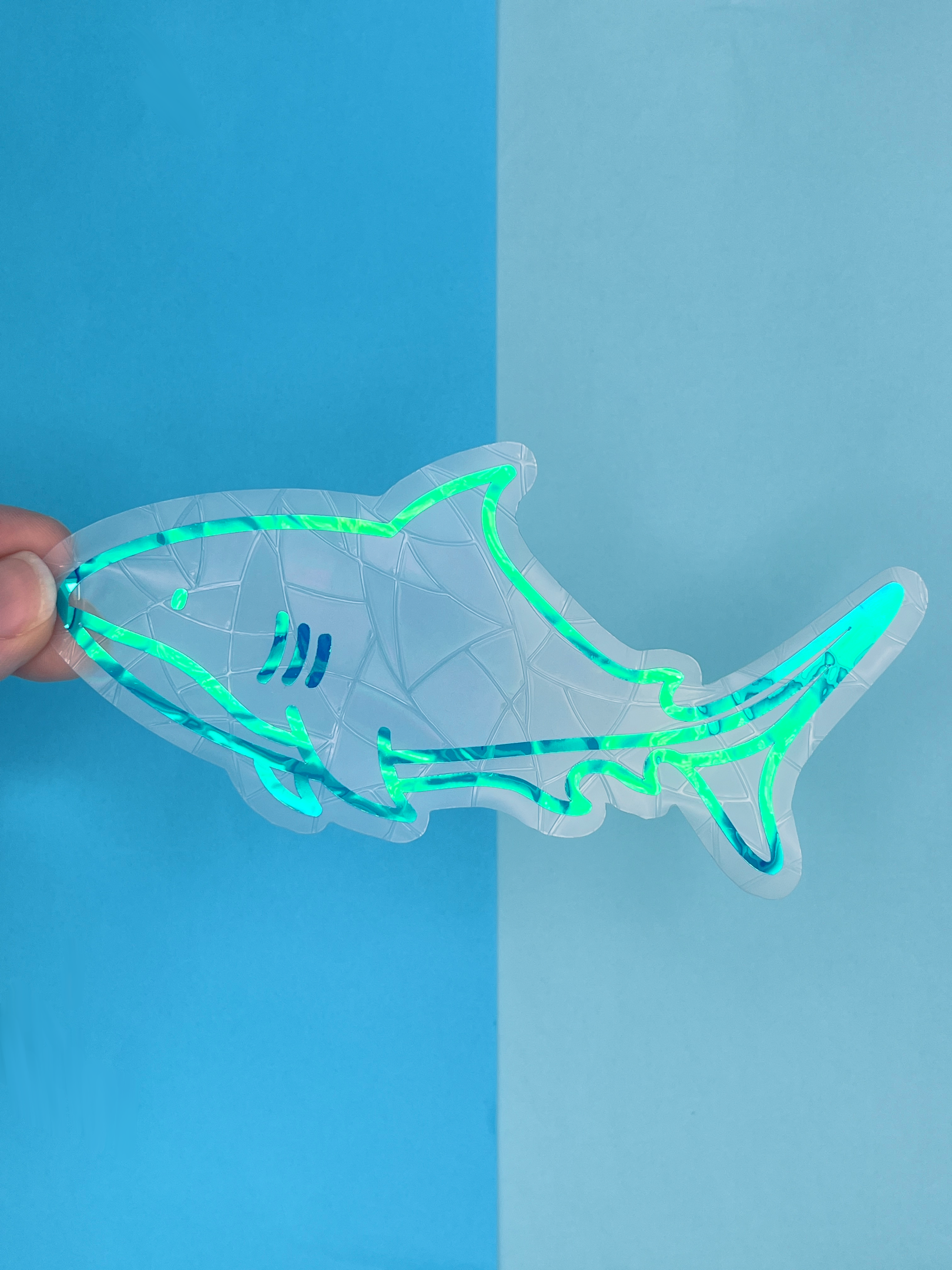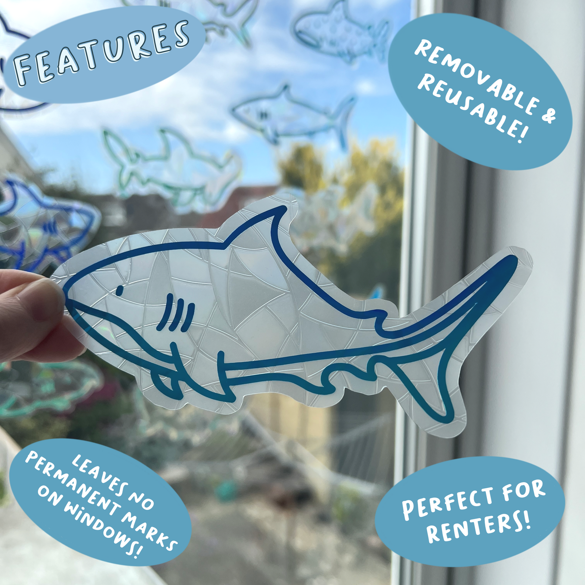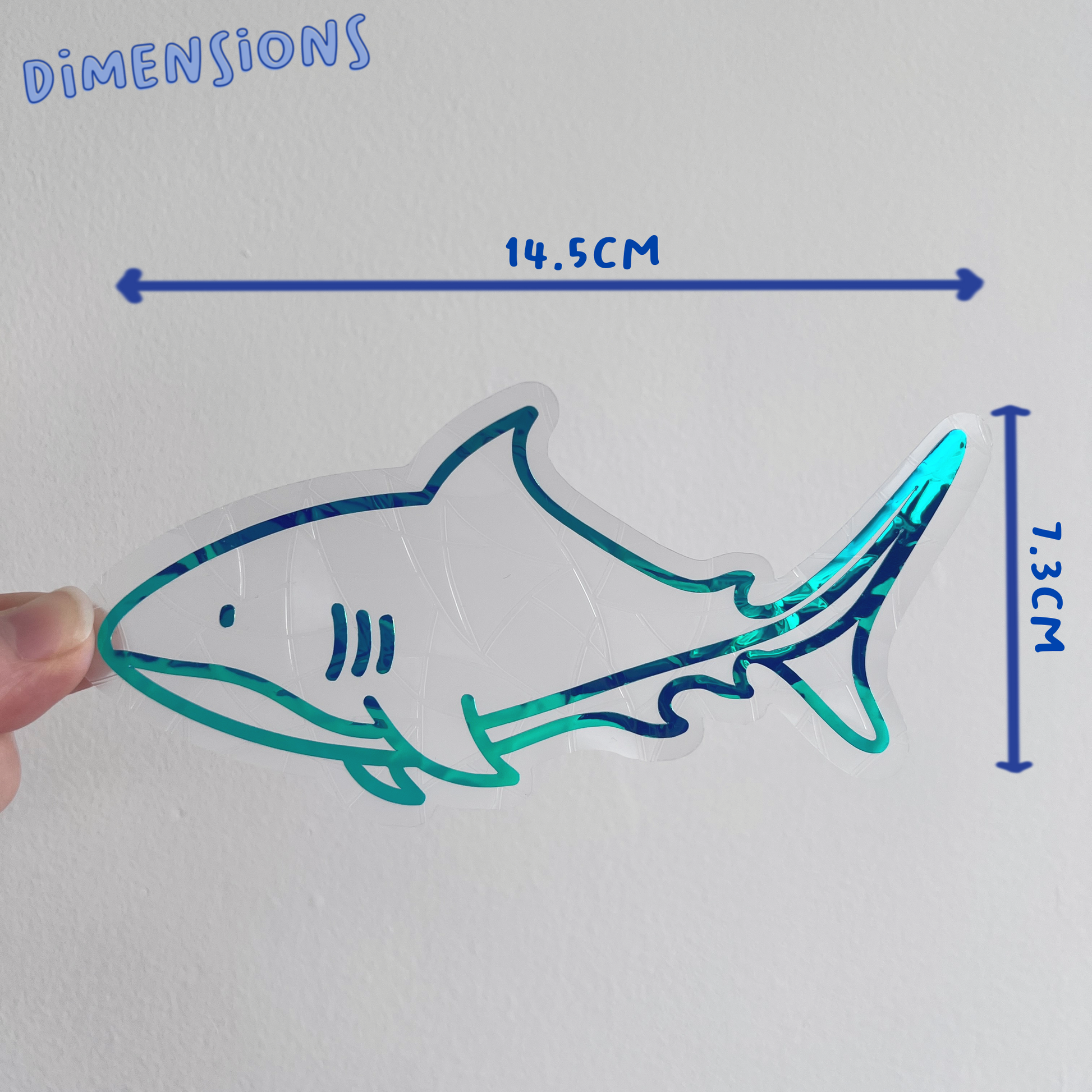 Each suncatcher has a holographic blue shark over the top of the background shape.