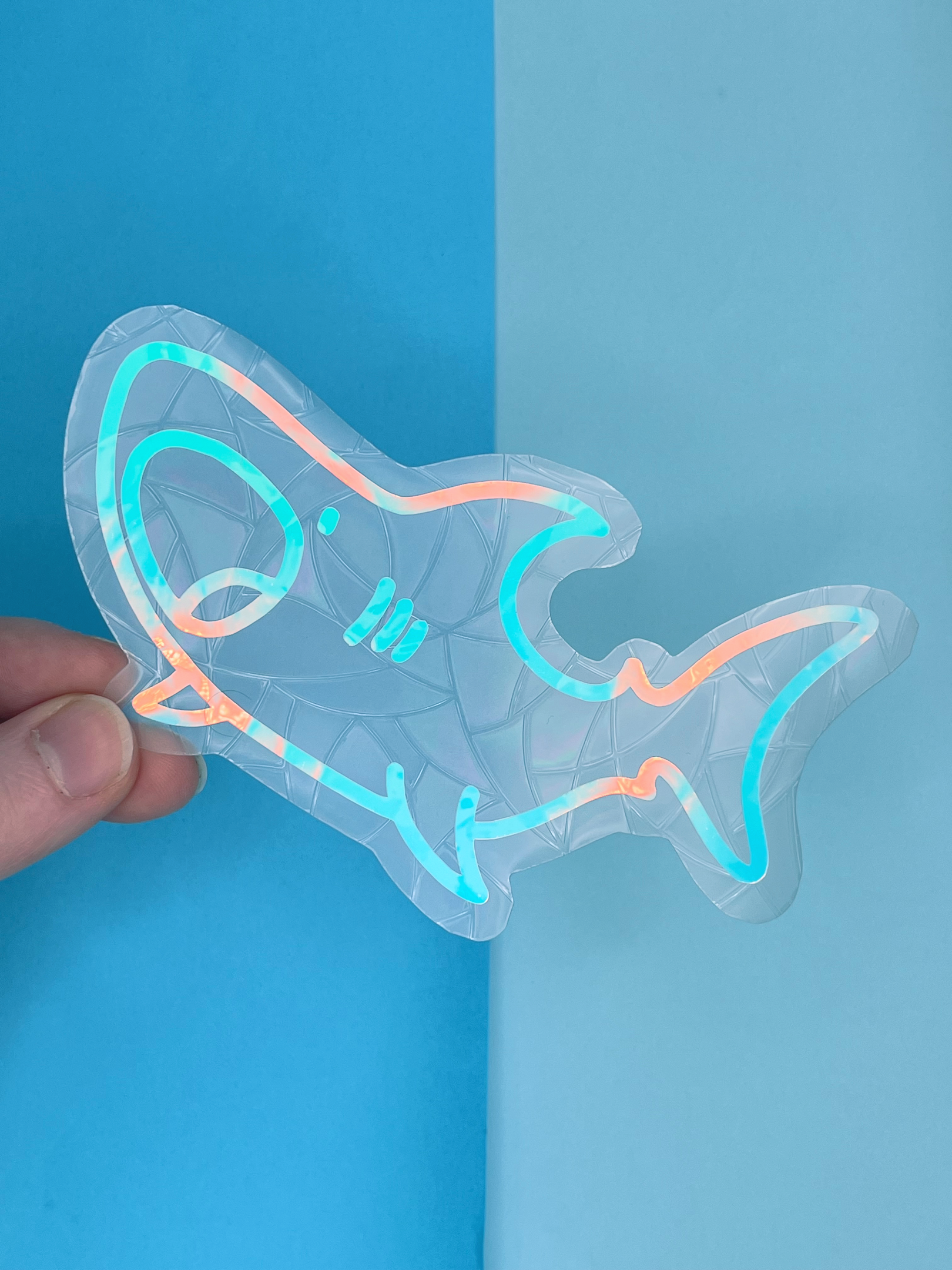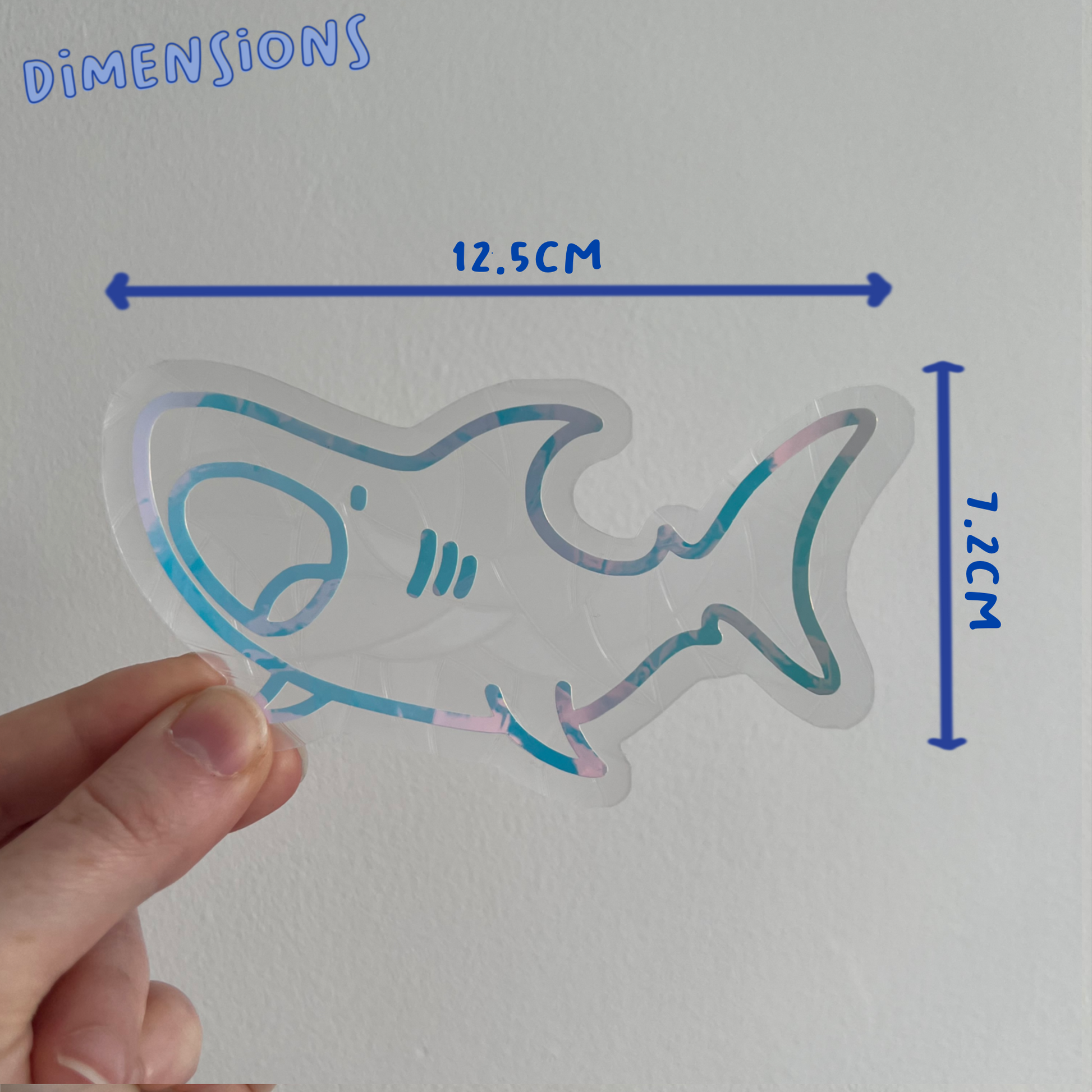 Each suncatcher has a holographic opal shark over the top of the background shape.