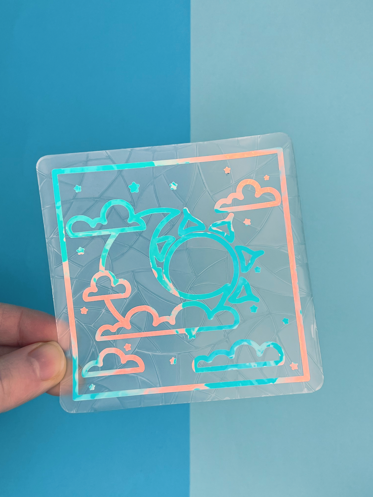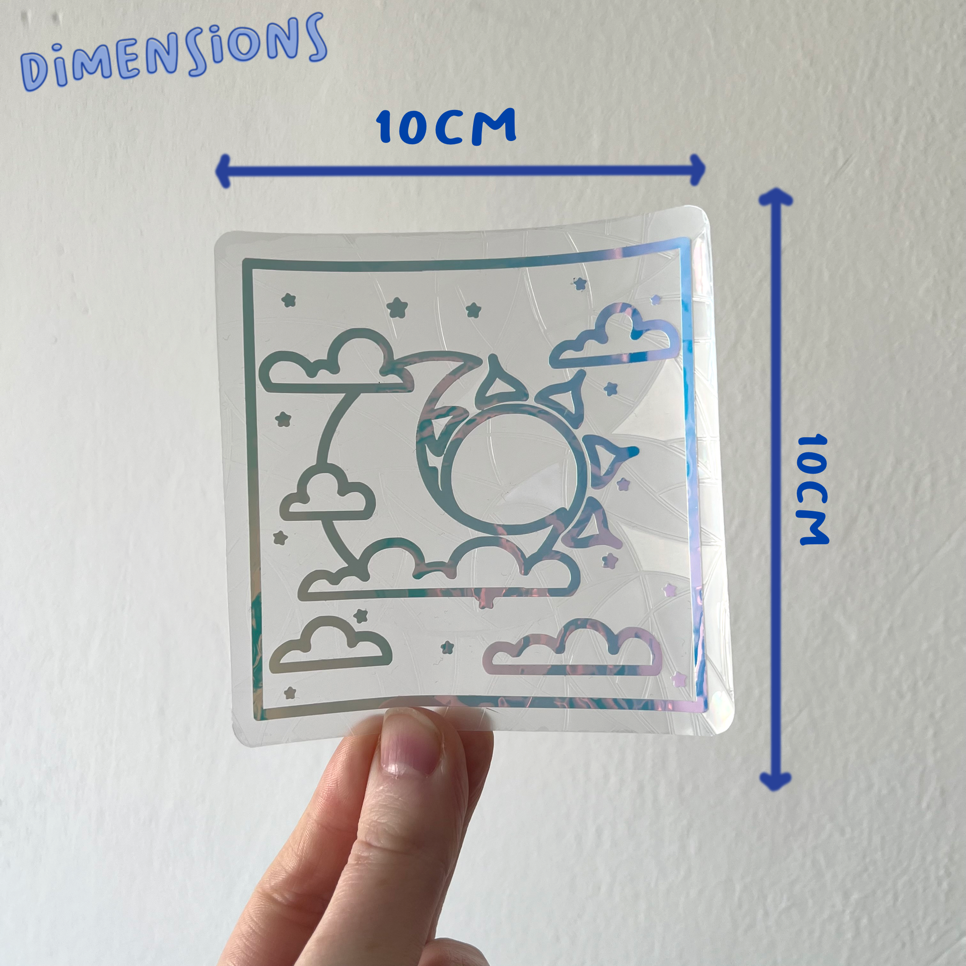 Each suncatcher has a holographic celestial scene over the top of the background shape.