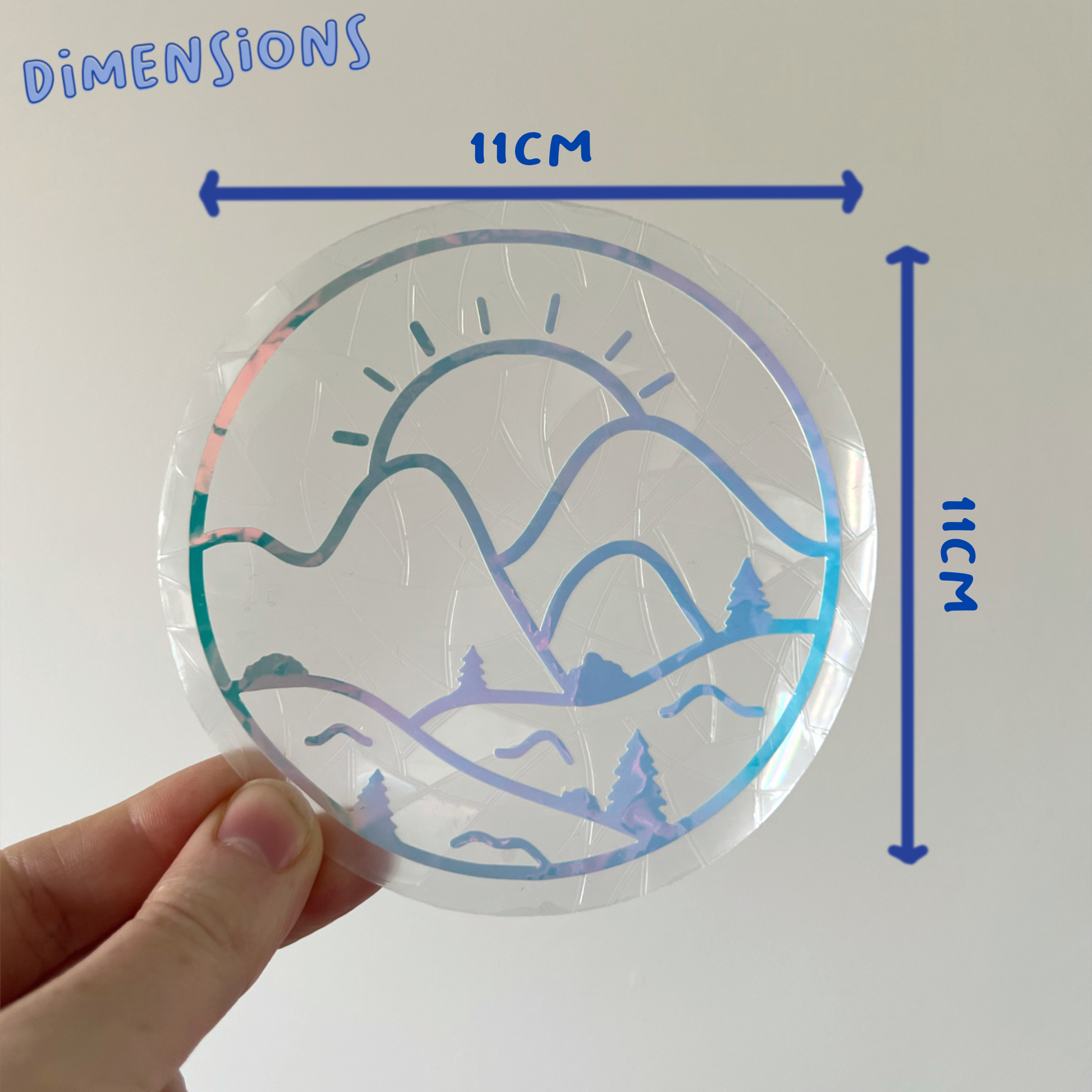 Each suncatcher has a holographic countryside scene over the top of the background shape.