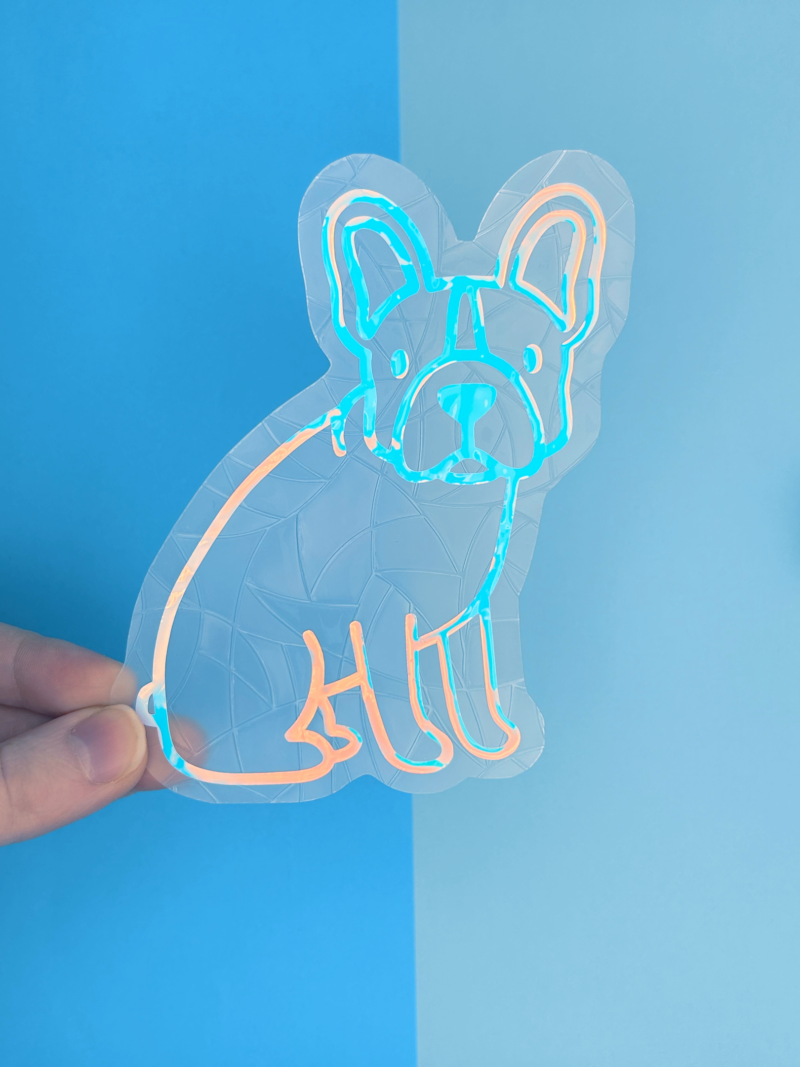 Each suncatcher has a holographic dog over the top of the background shape.