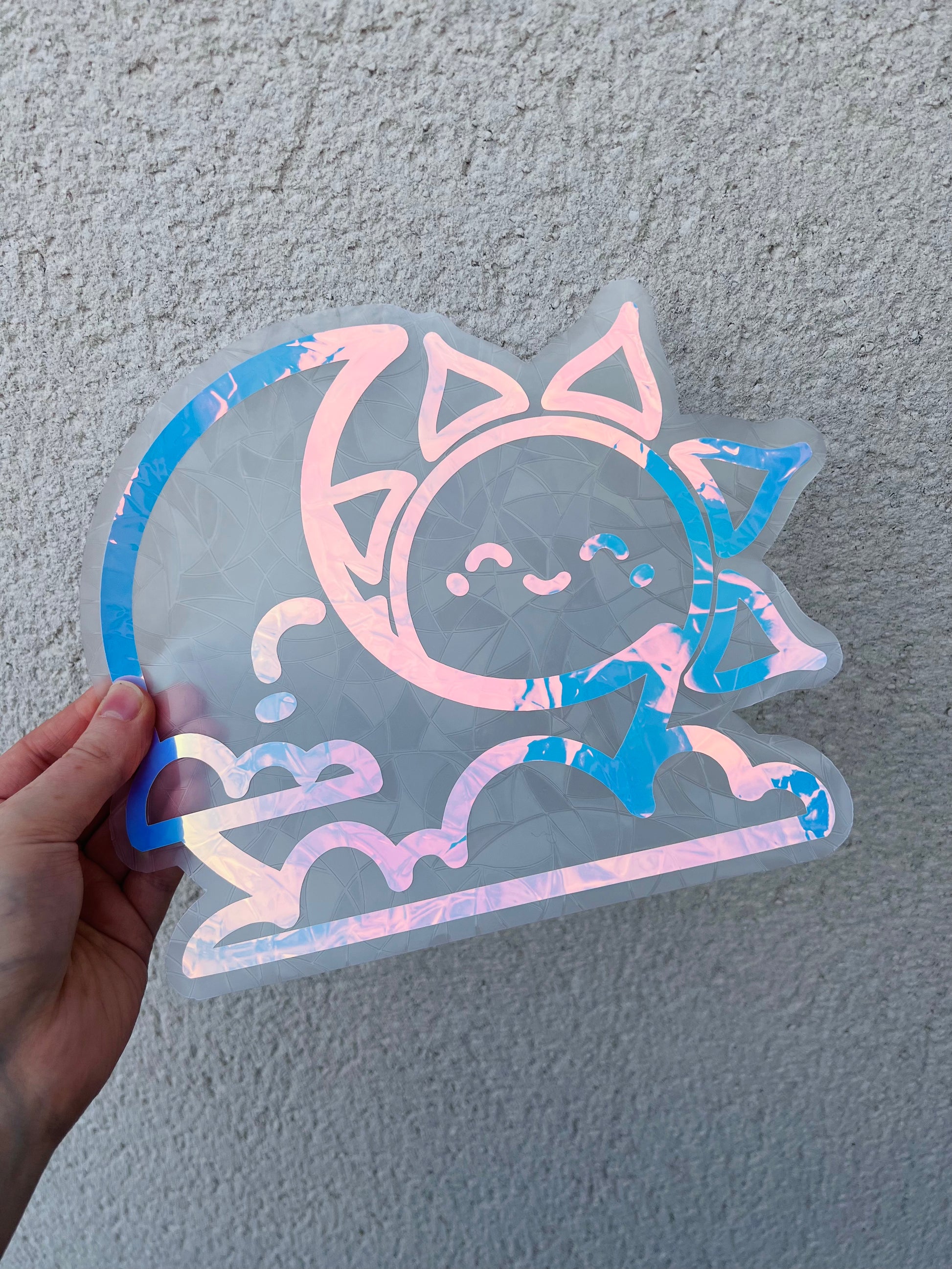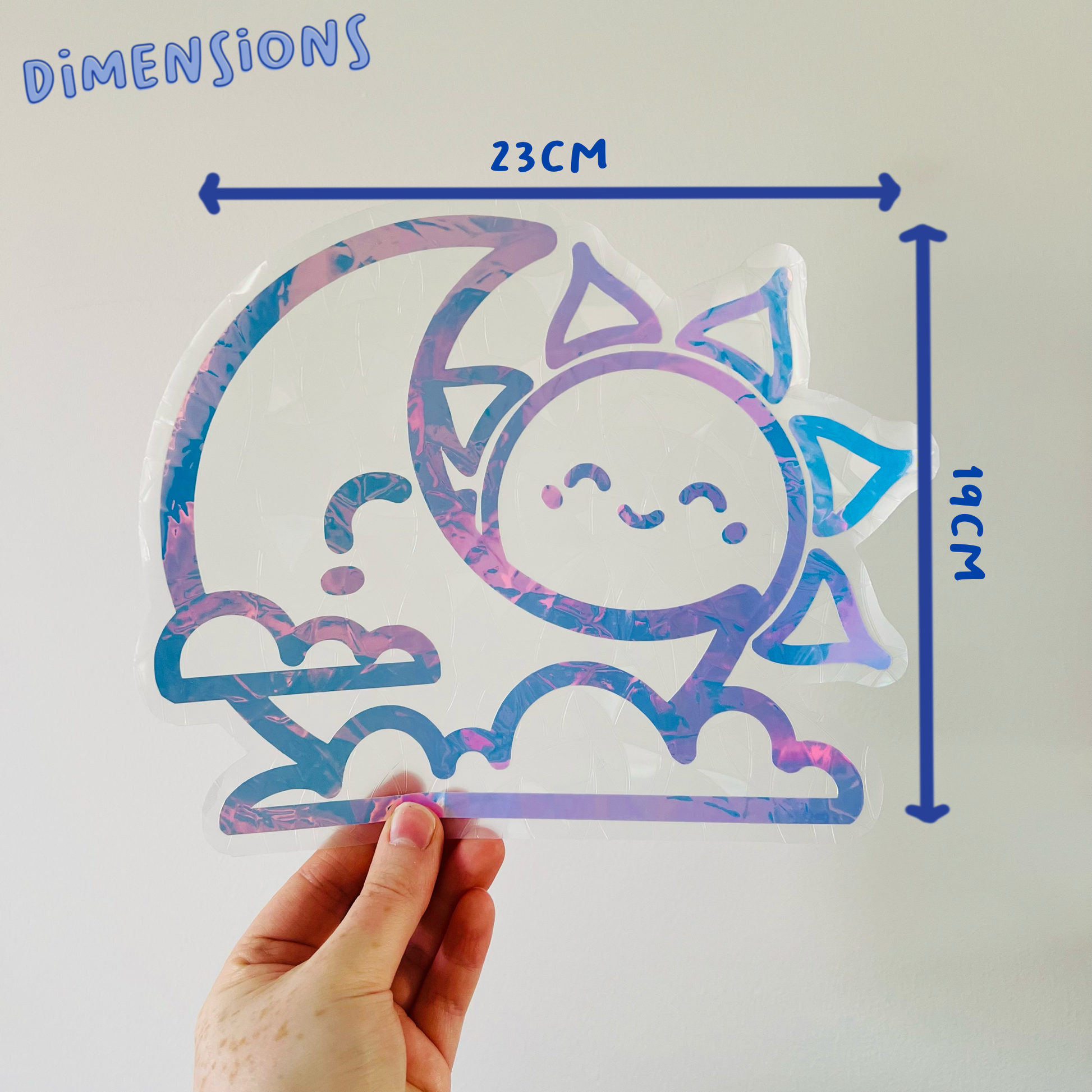 Each suncatcher has a holographic celestial scene over the top of the background shape.