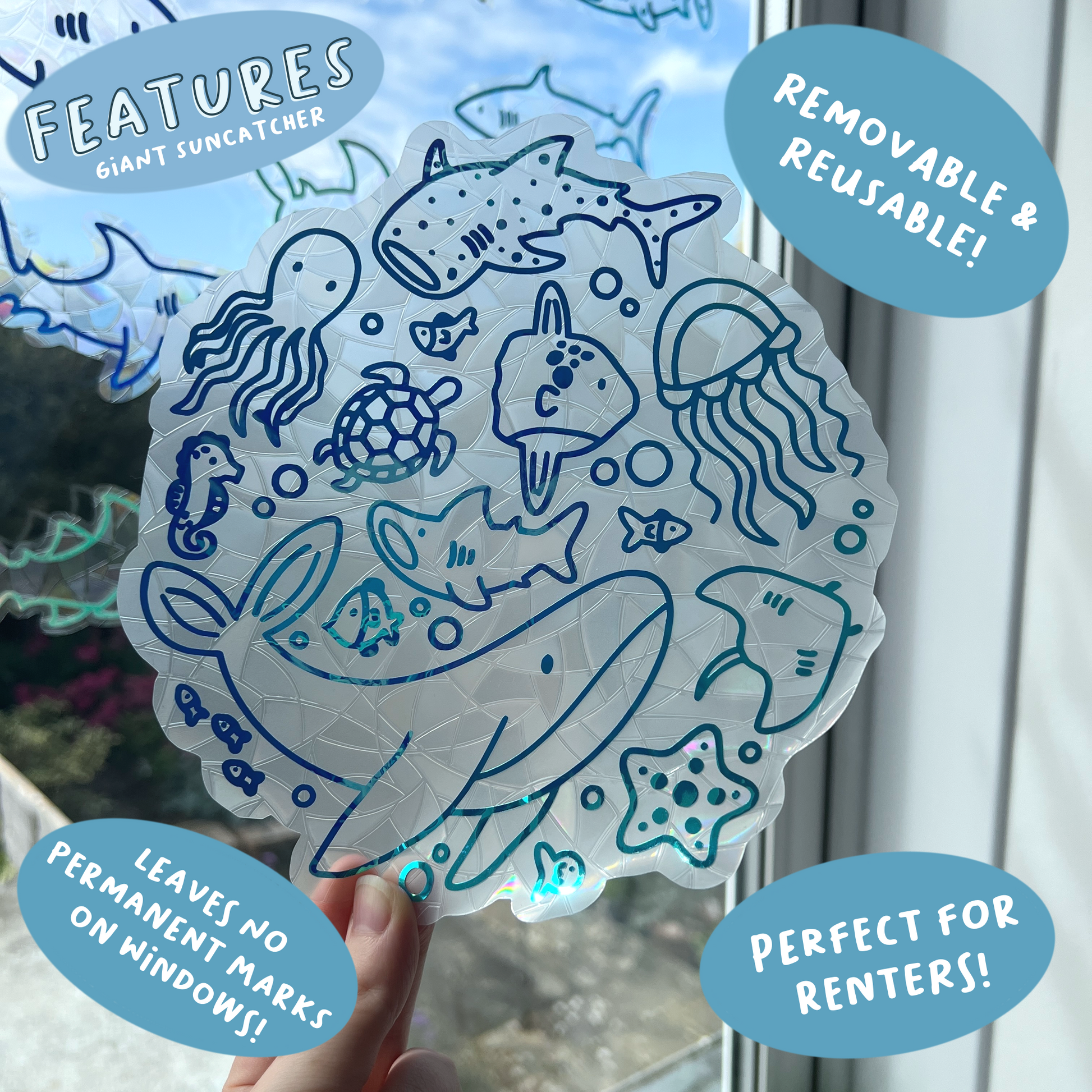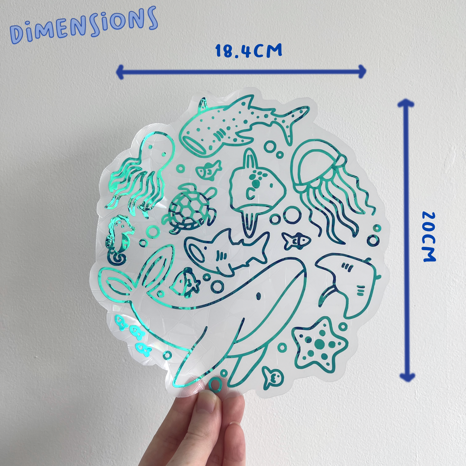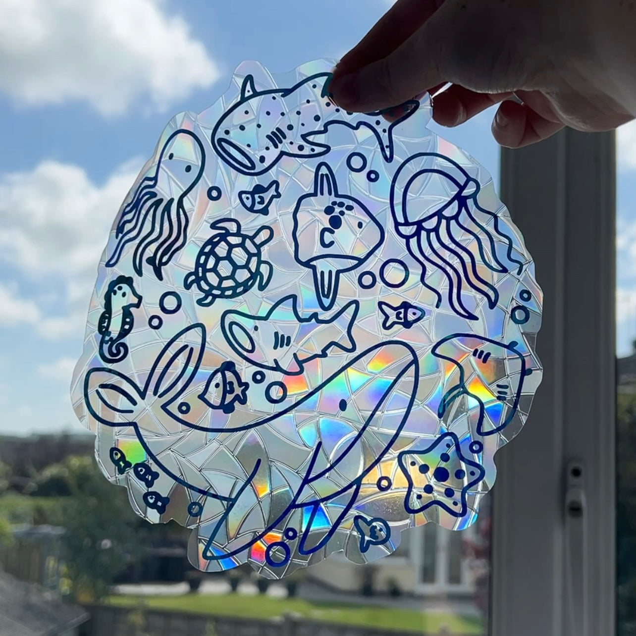 Each suncatcher has a holographic sealife scene over the top of the background shape.