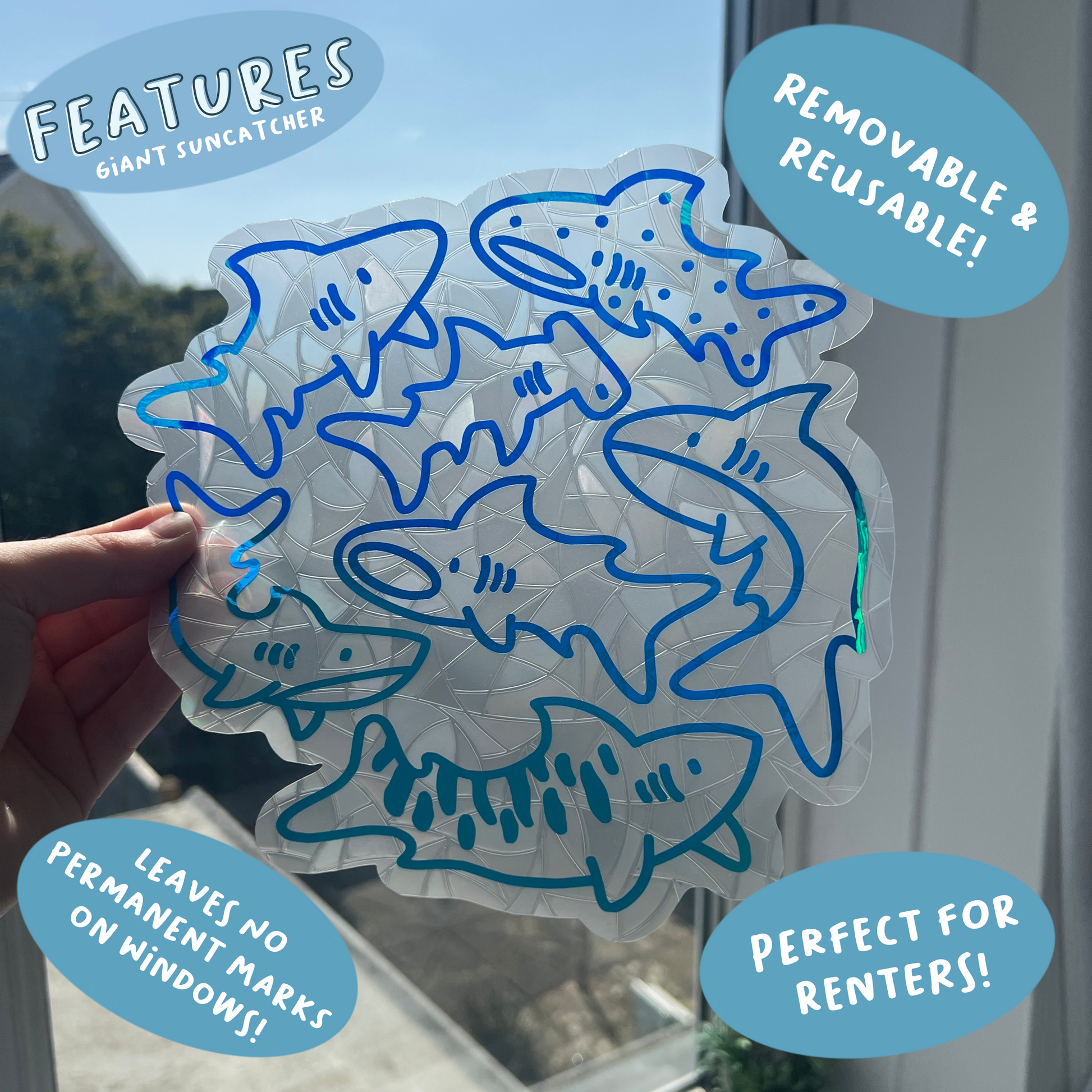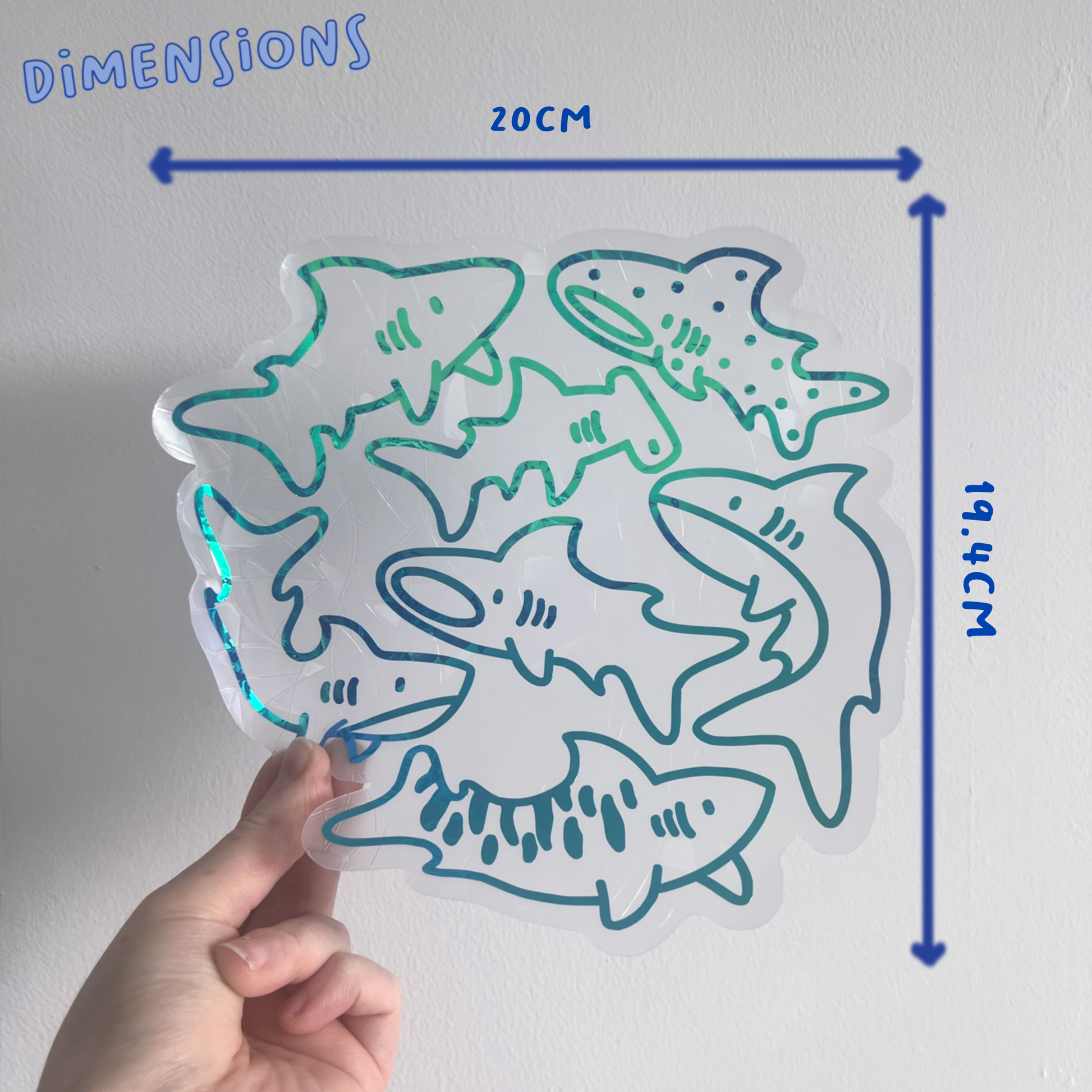 Each suncatcher has a holographic shark scene over the top of the background shape.