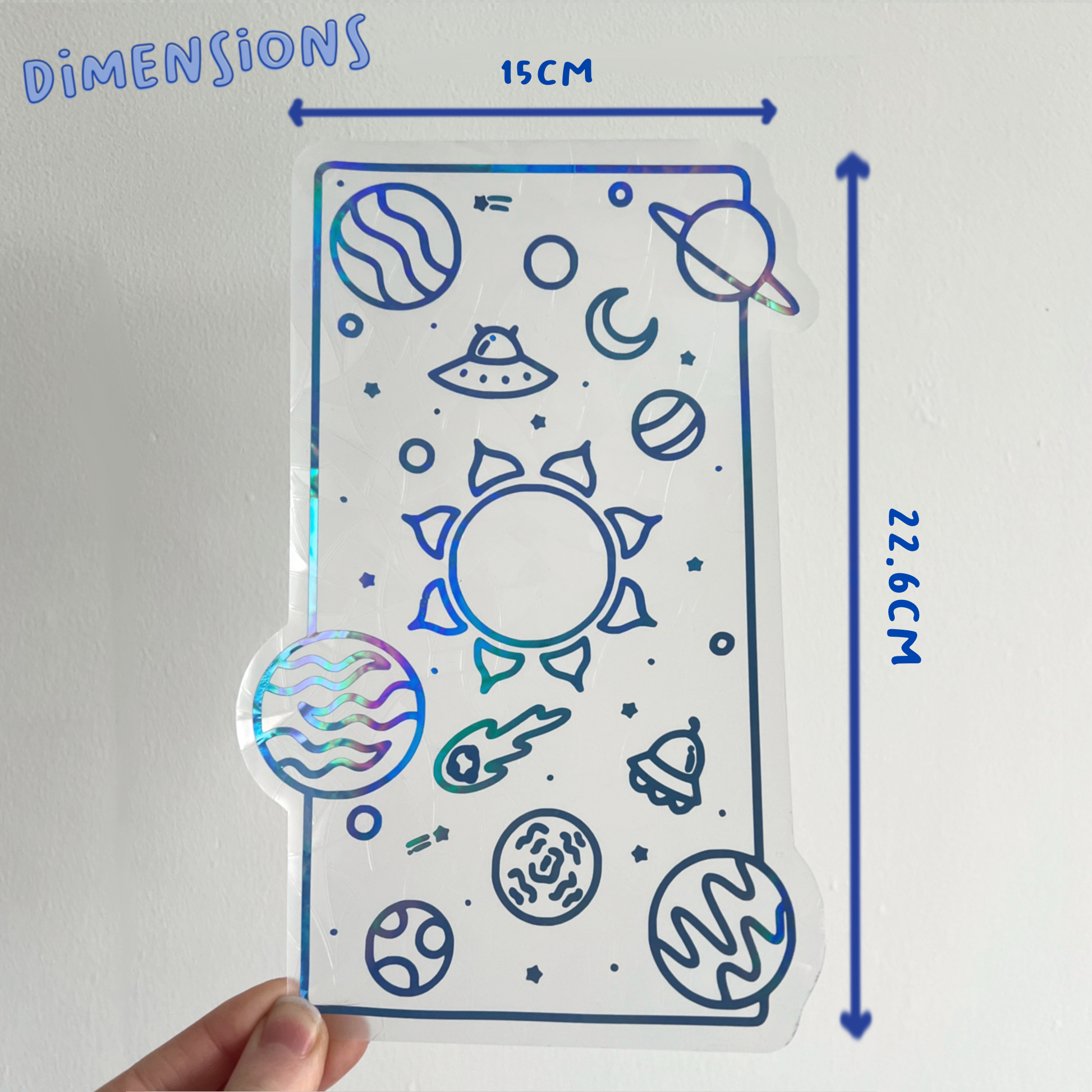 Each suncatcher has a holographic blue space scene over the top of the background shape.