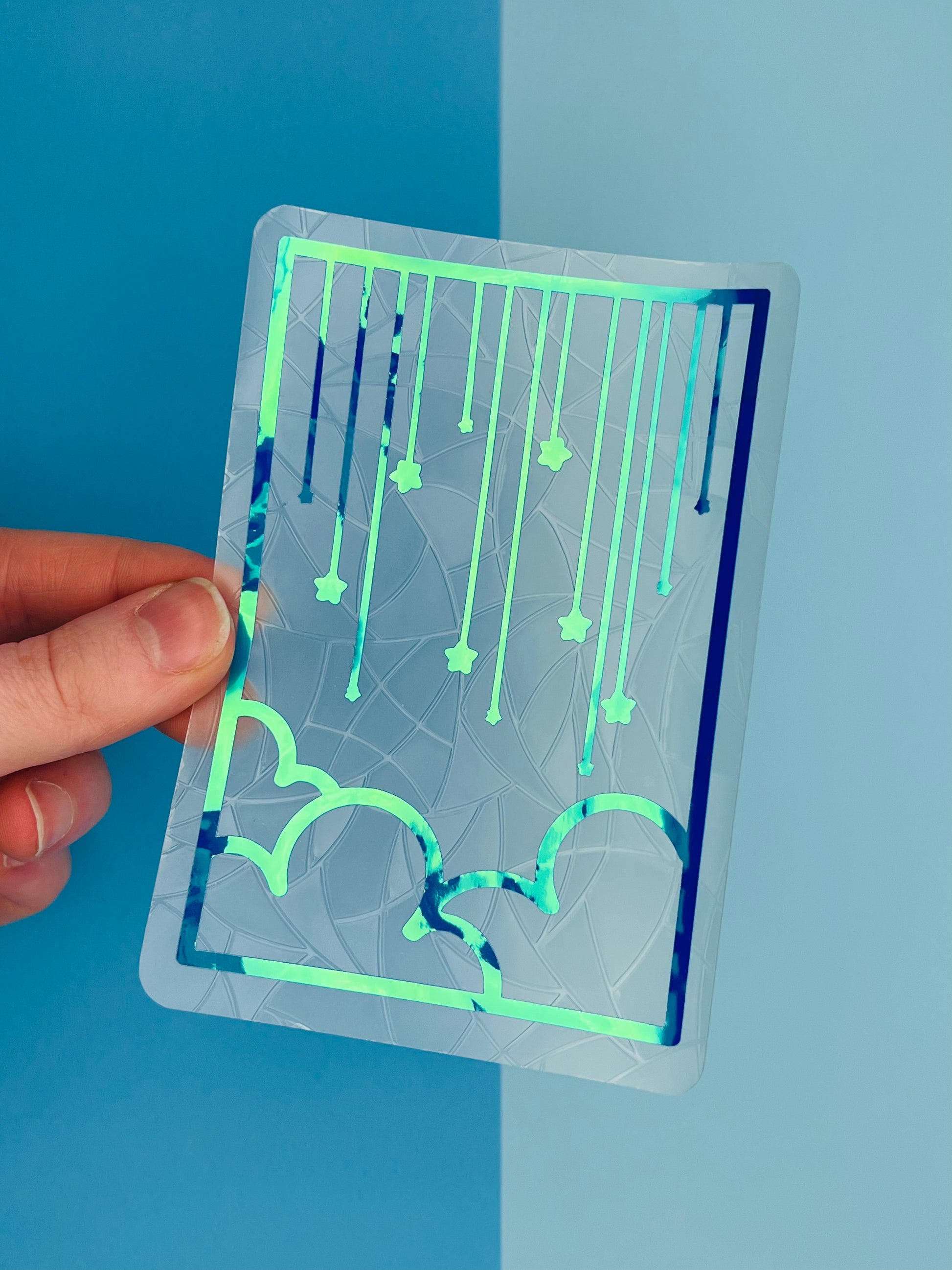 Each suncatcher has a holographic blue star scene over the top of the background shape.