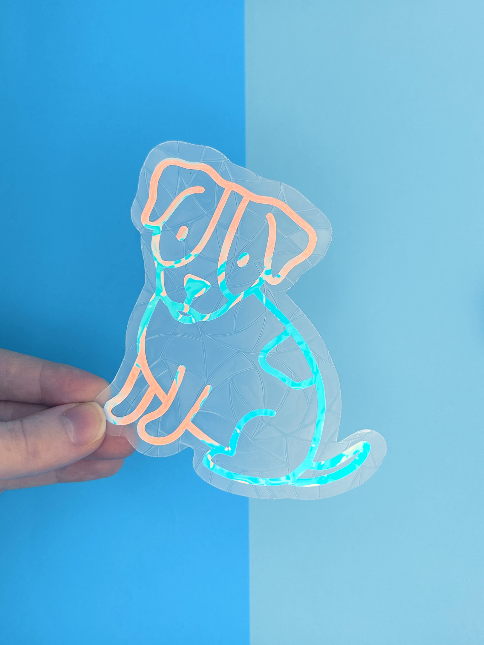Adorable Dog Suncatcher that sticks on to your window and casts rainbows across your room on bright sunny days! Perfect addition to any dog lovers window!