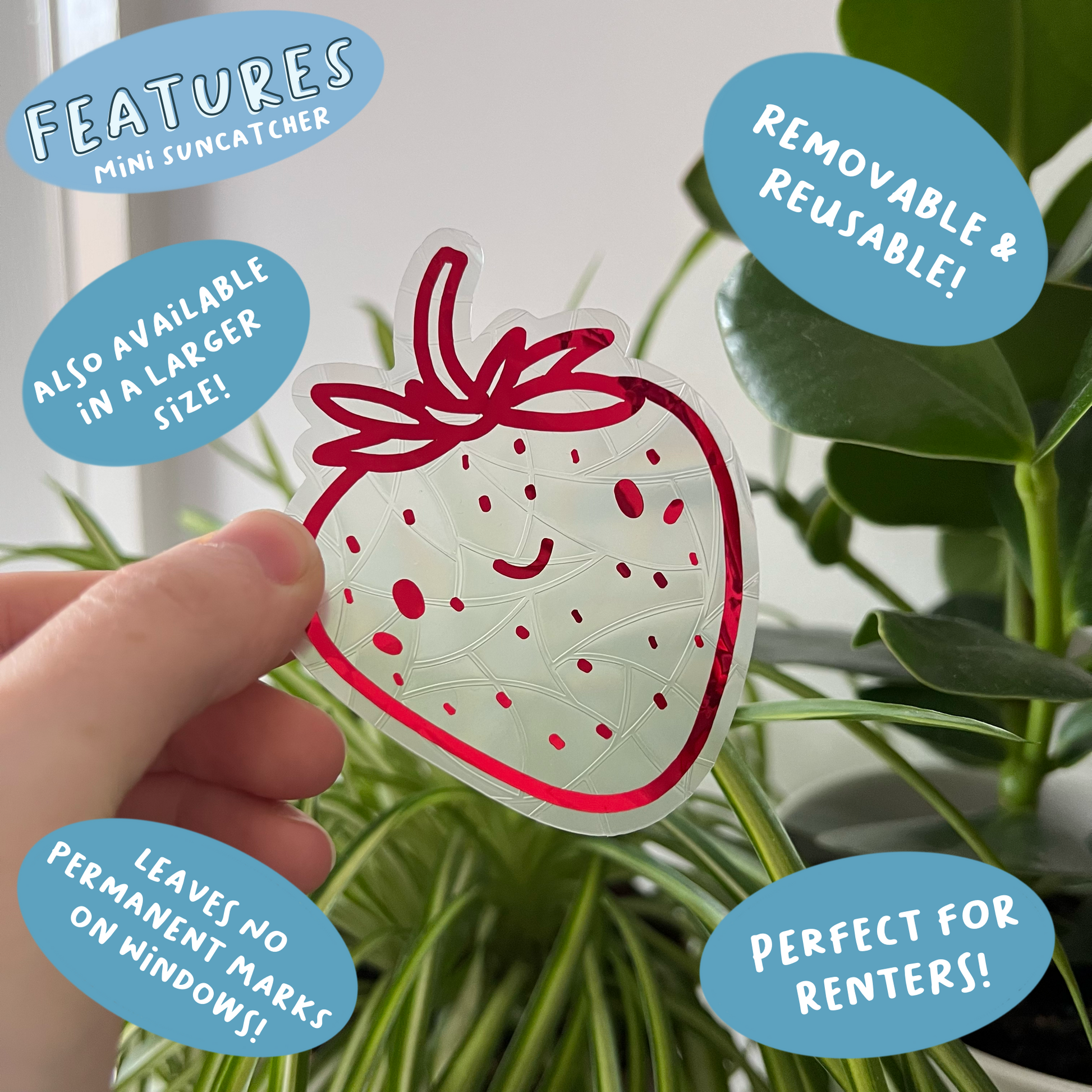 Each suncatcher has a holographic red strawberry over the top of the background shape.