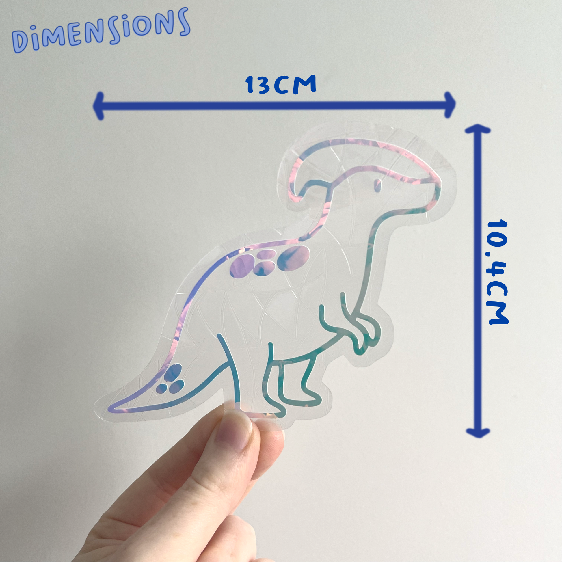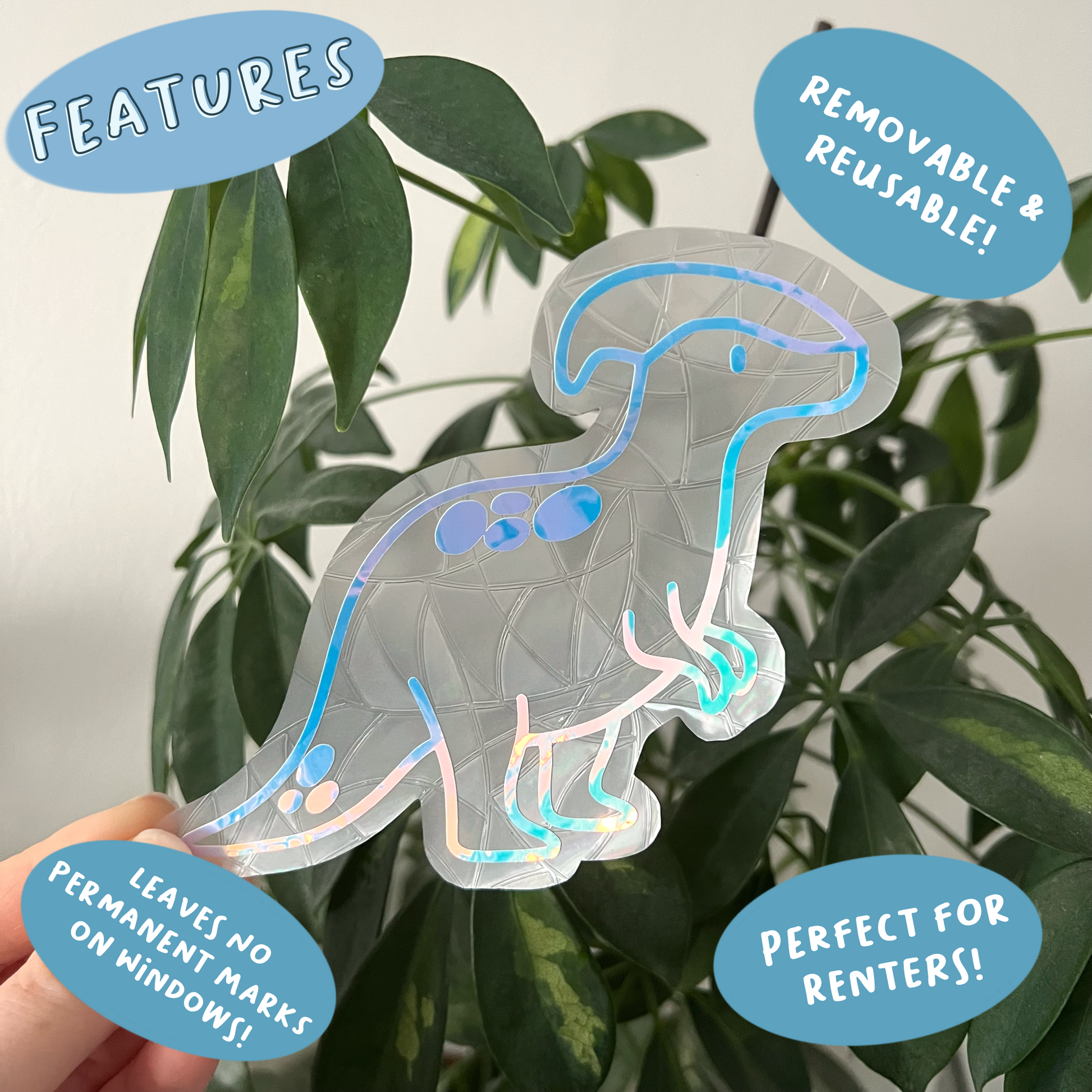 Each suncatcher has a holographic dino over the top of the background shape.