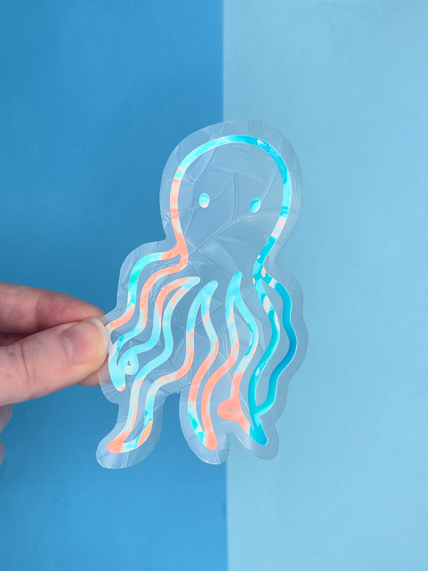 Each suncatcher has a holographic octopus over the top of the background shape.
