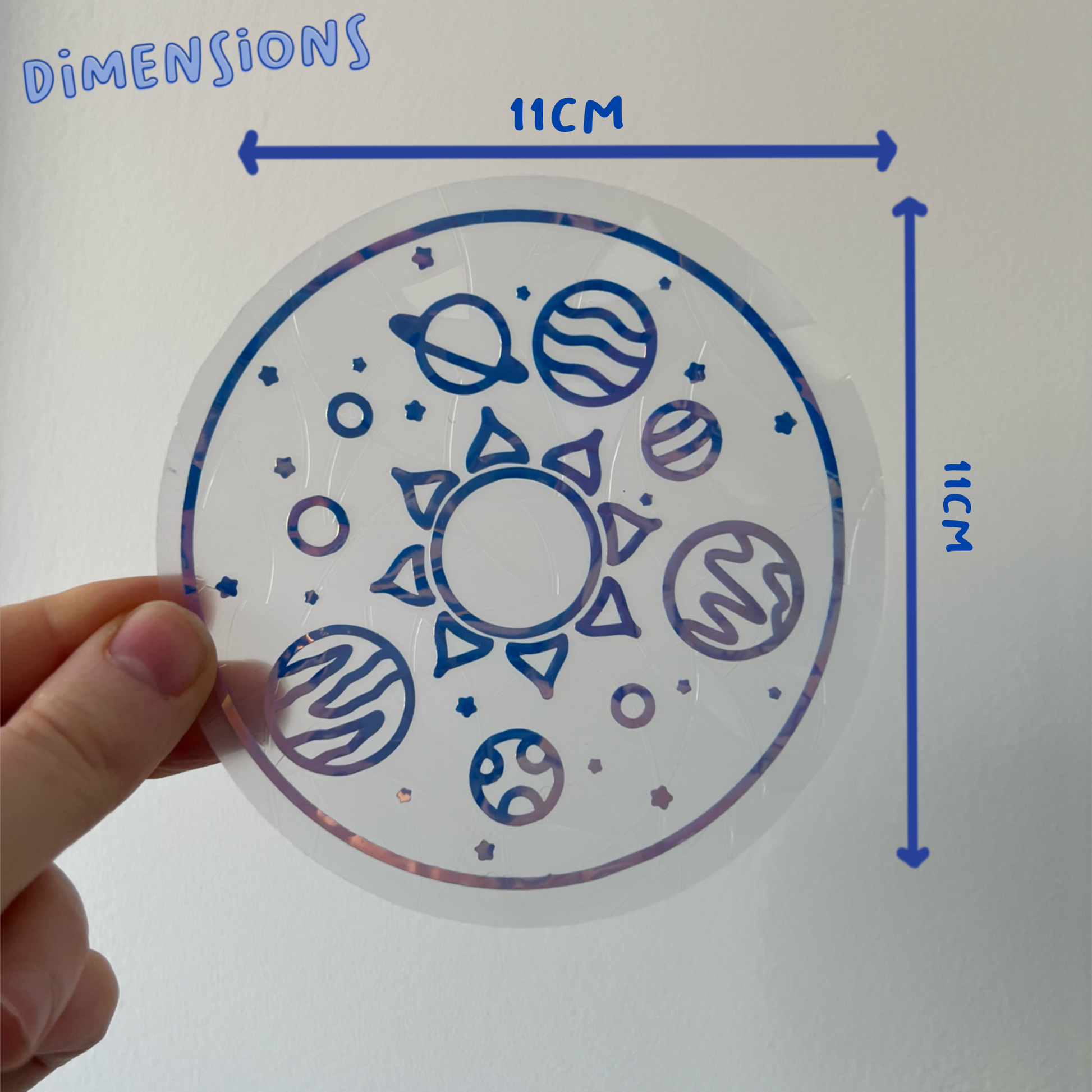 Each suncatcher has a holographic space scene over the top of the background shape.
