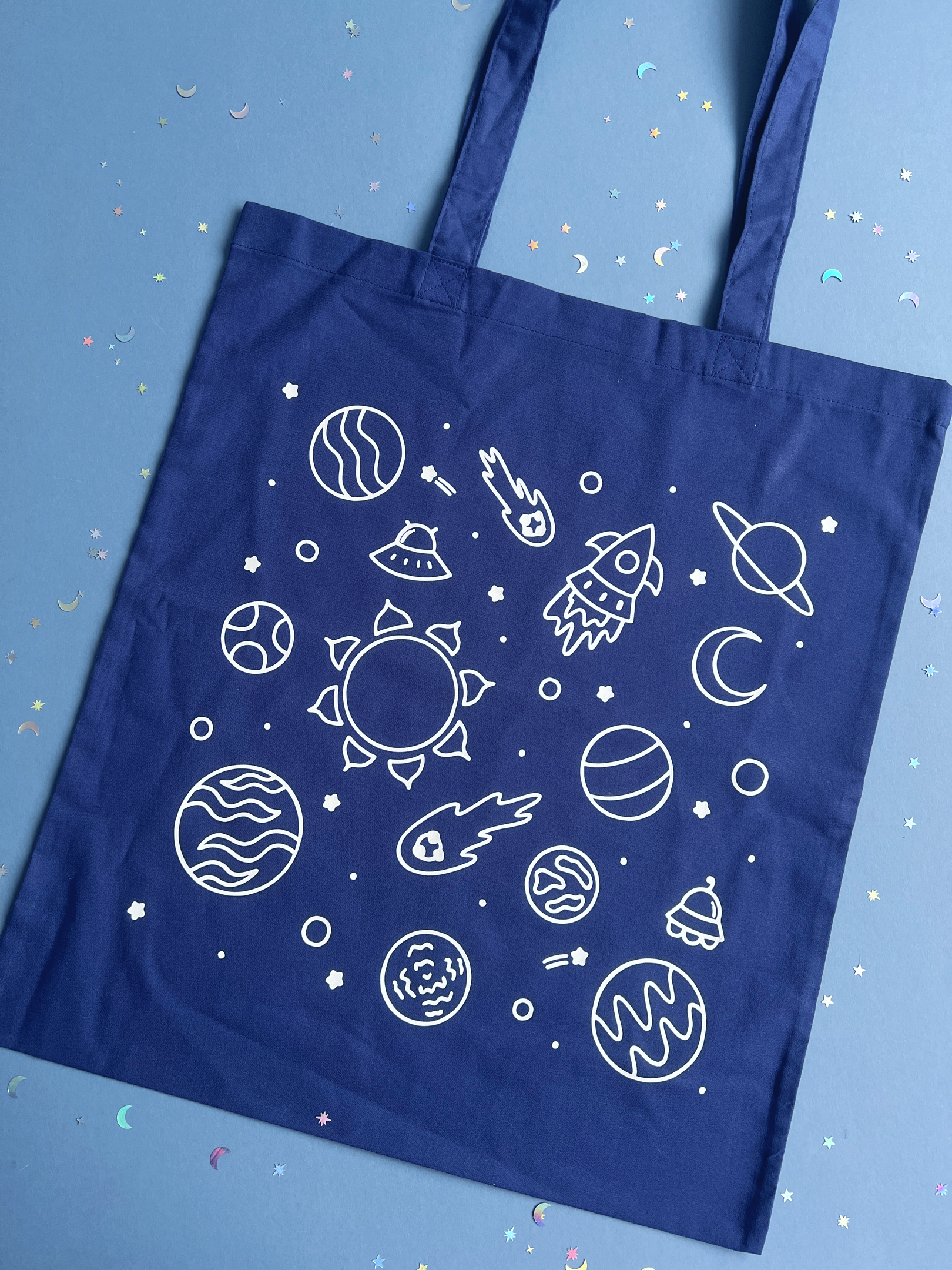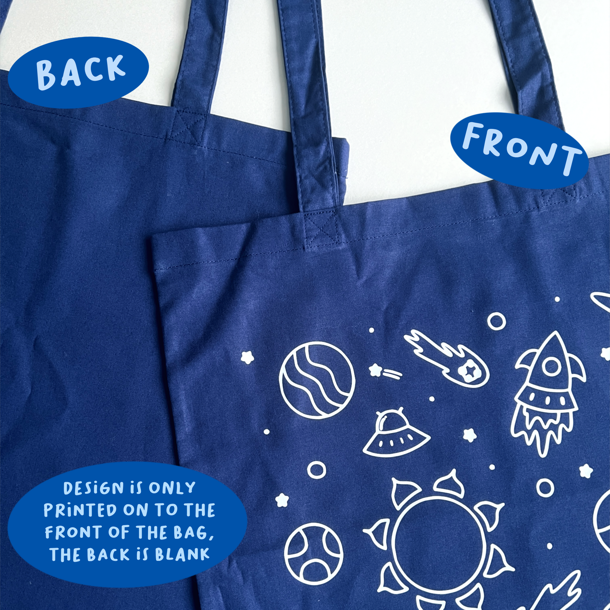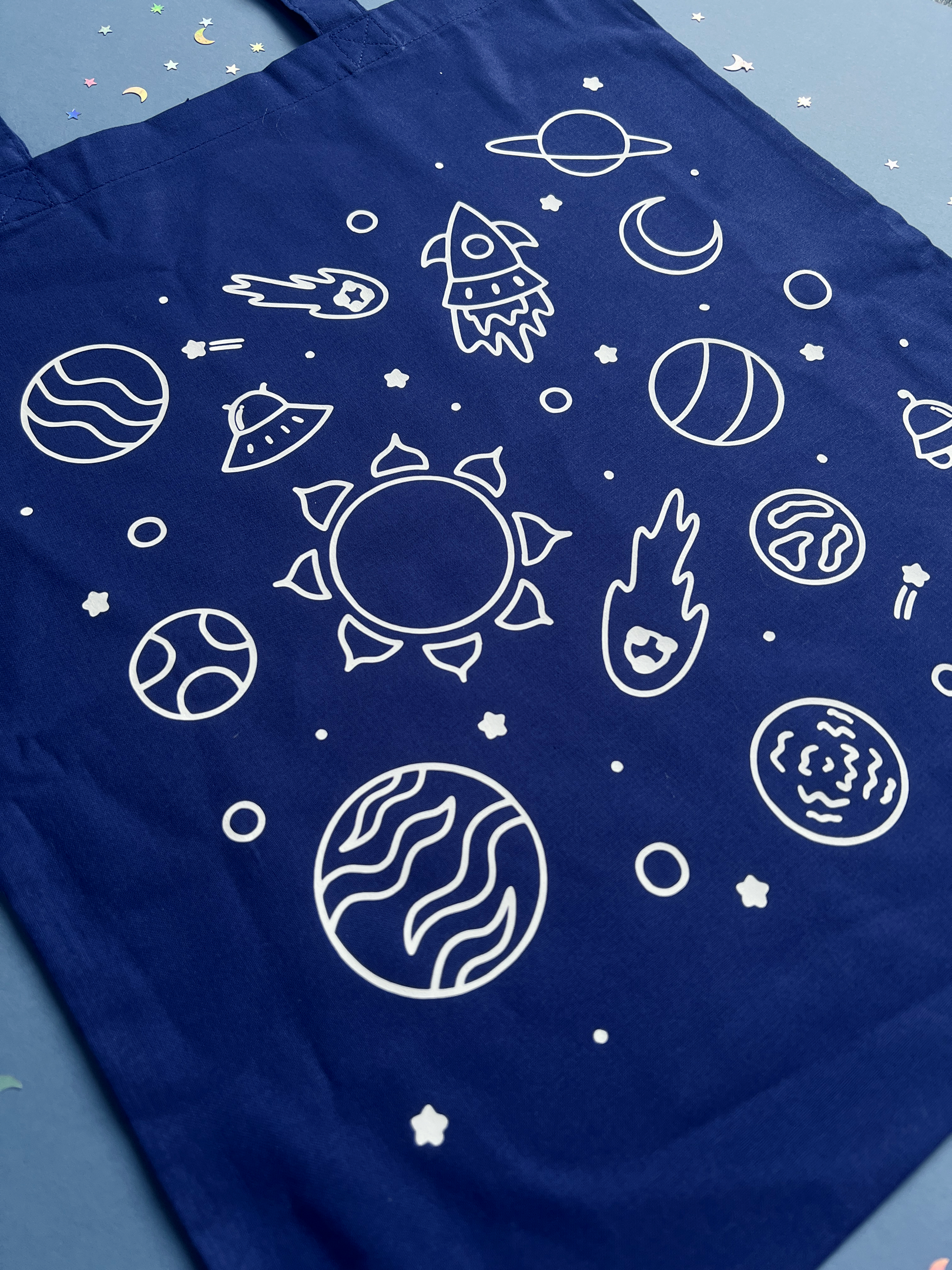 All tote bags are made from cotton with a white vinyl space design over the top.