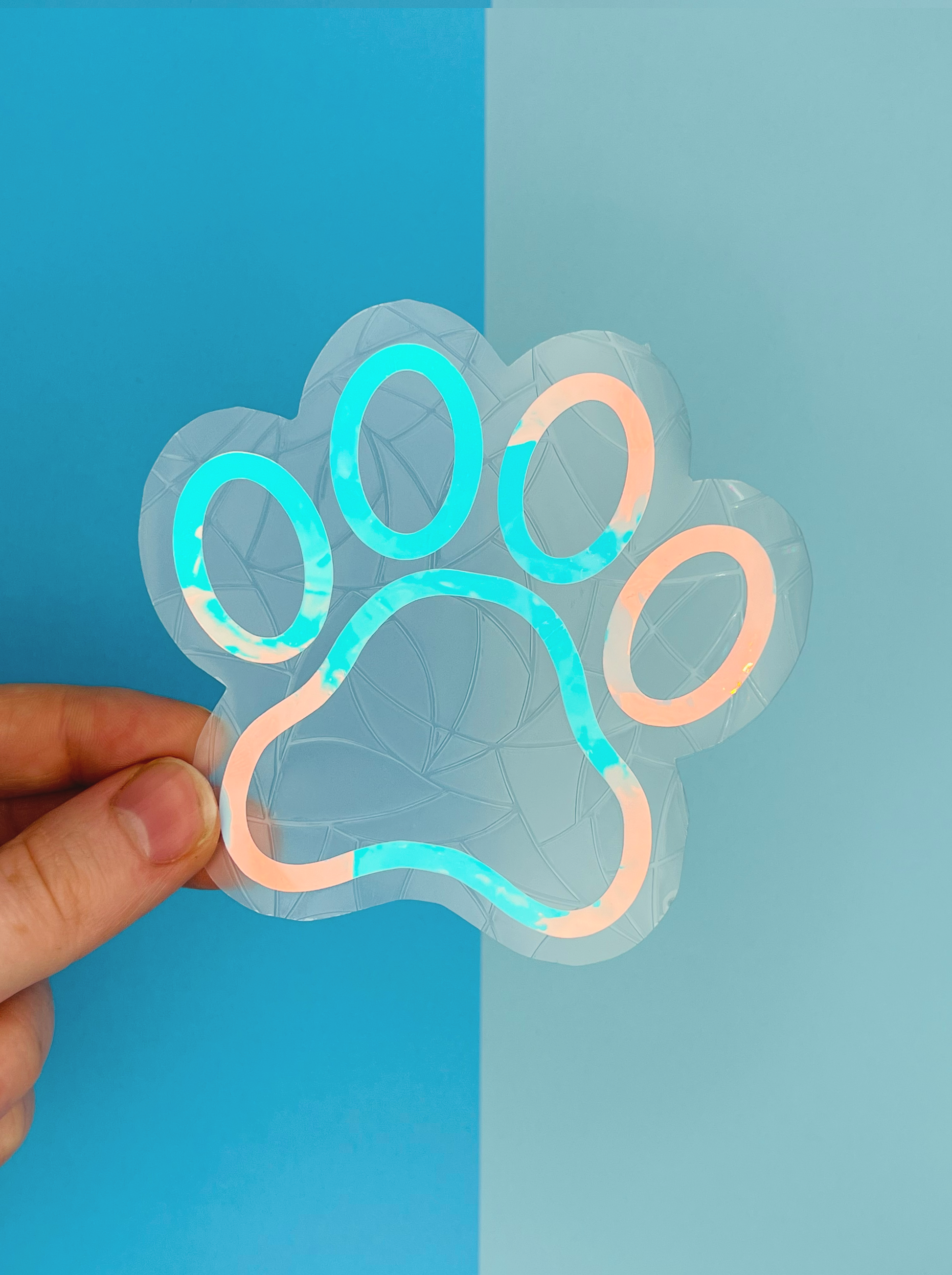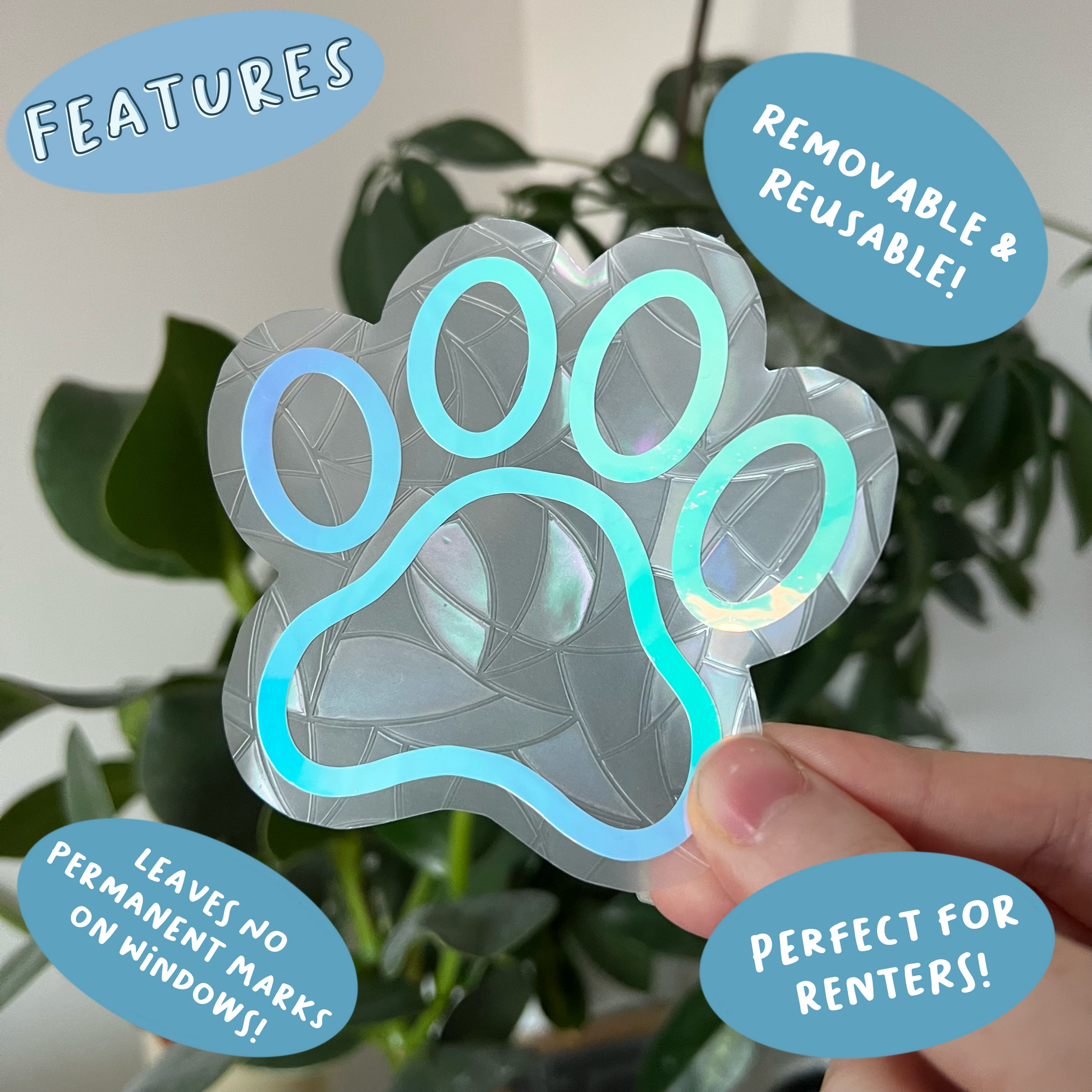 Each suncatcher has a holographic paw print over the top of the background shape.