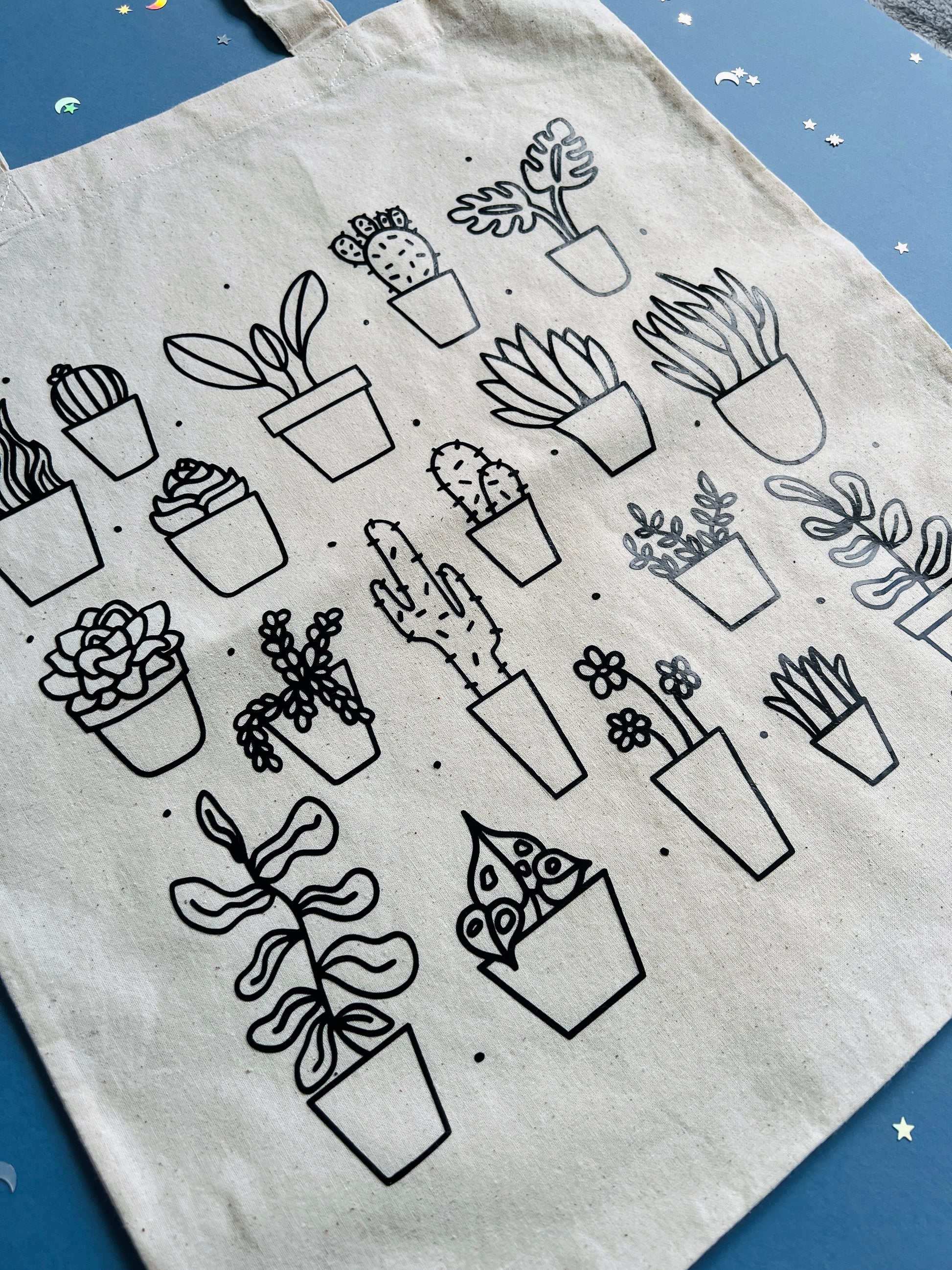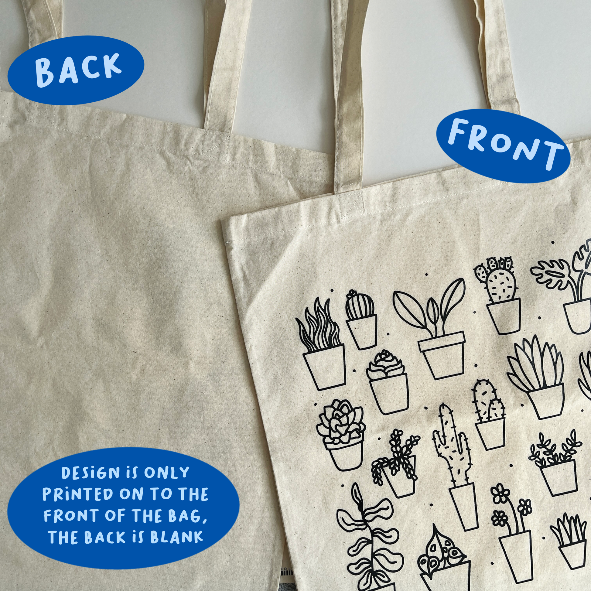All tote bags are made from cotton canvas with a black vinyl plant design over the top.