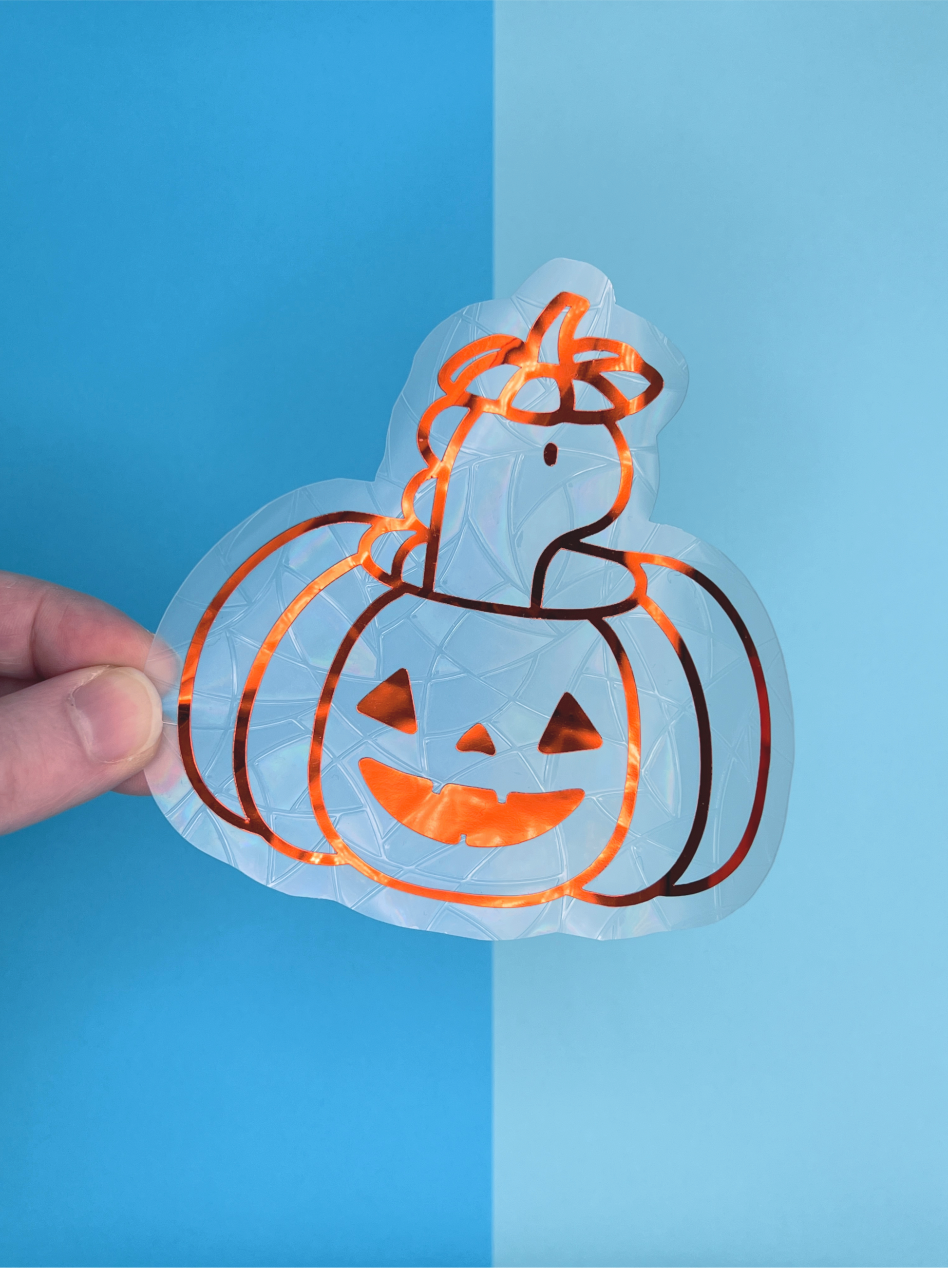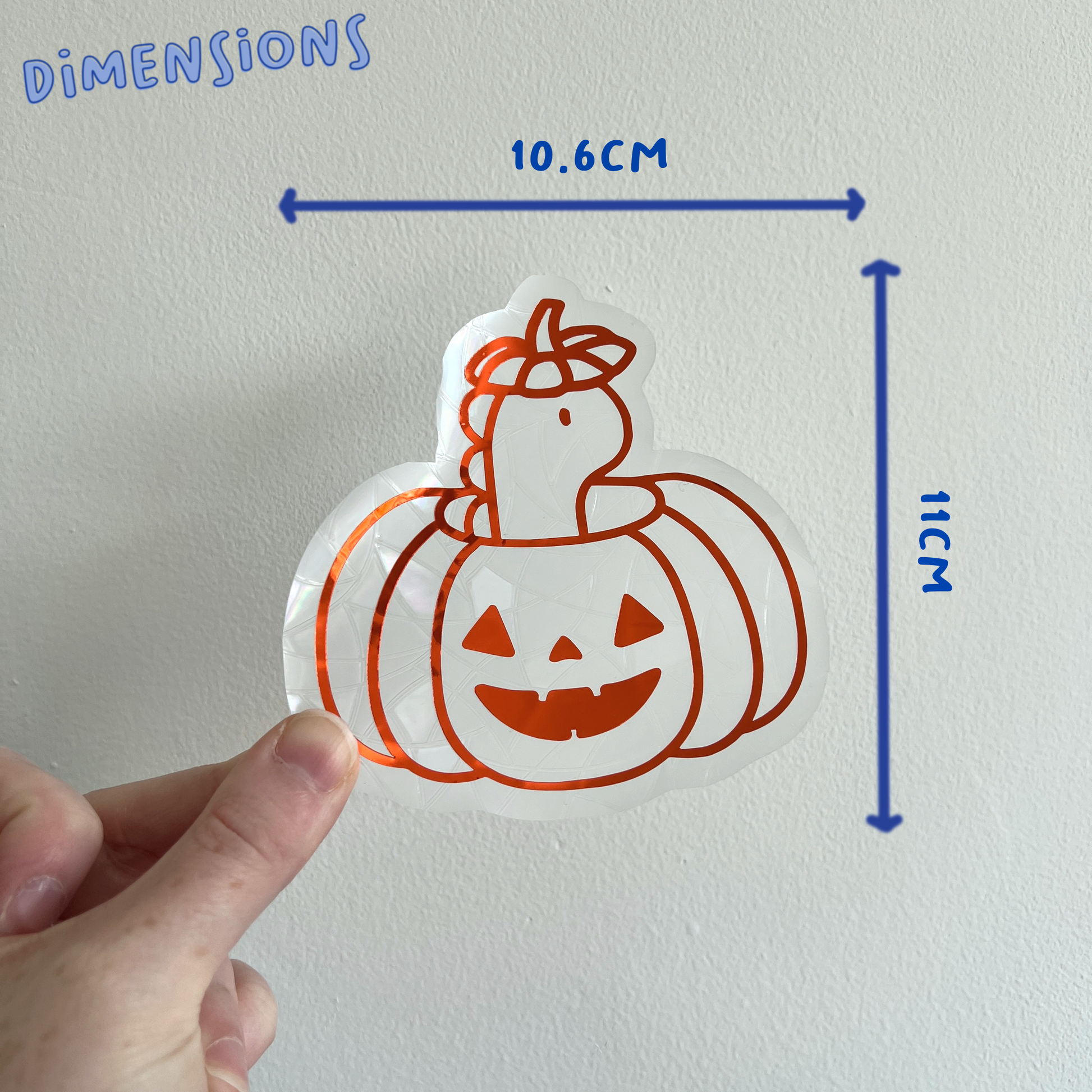 Each suncatcher has a holographic pumpkin dino over the top of the background shape.