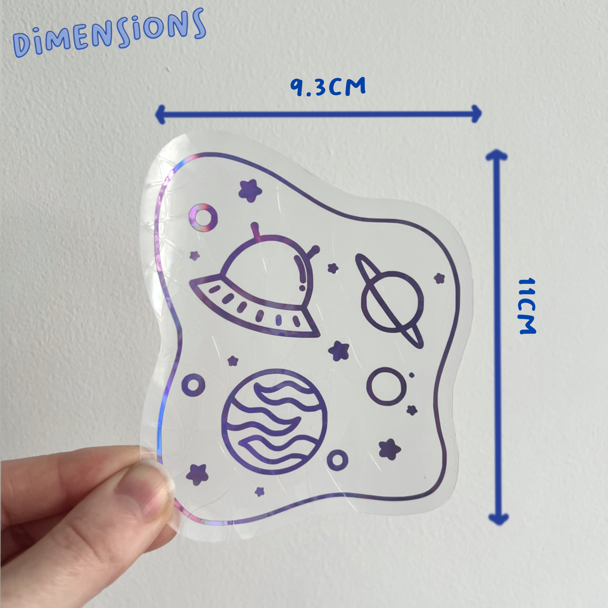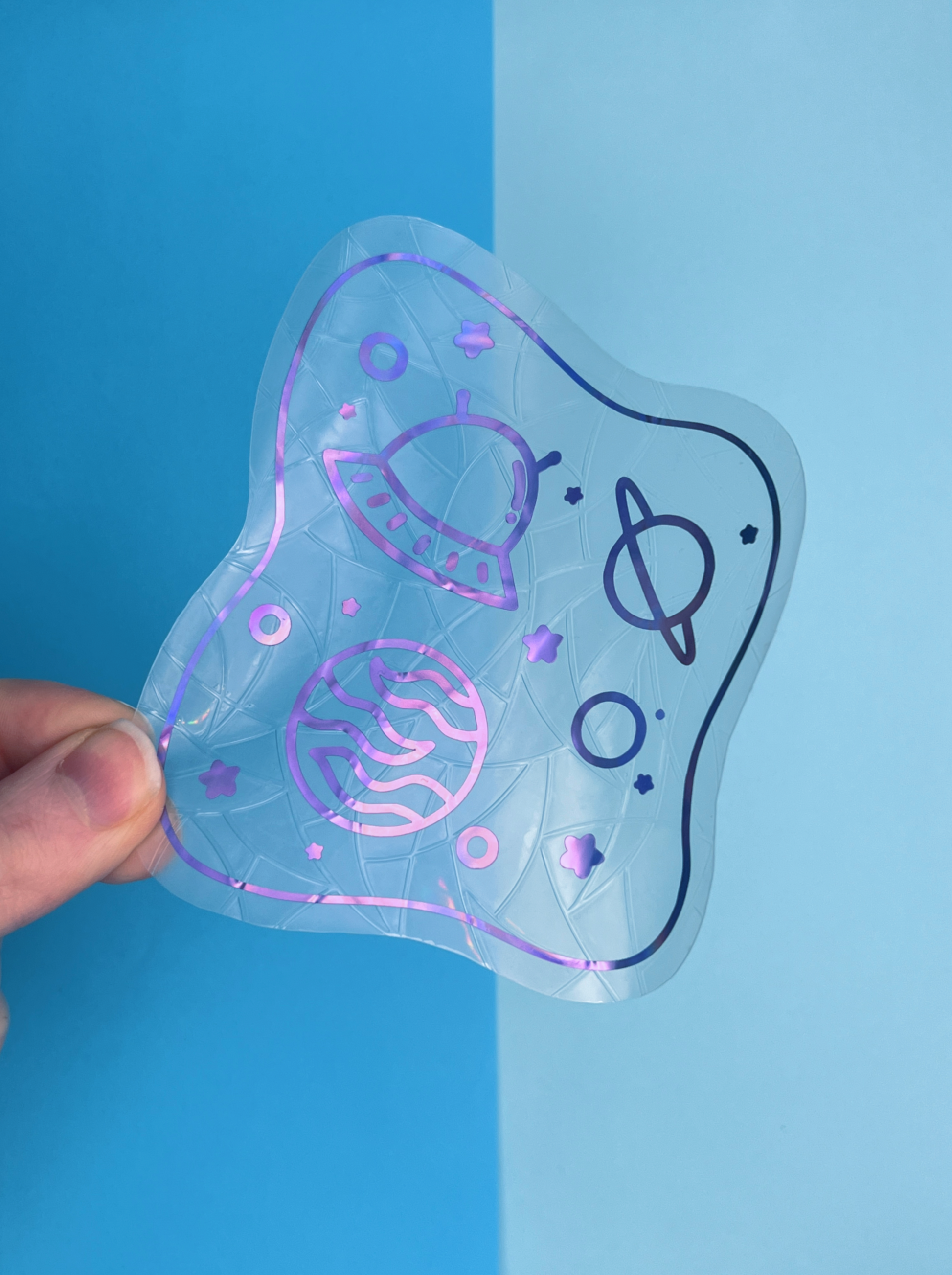 Each suncatcher has a holographic purple space scene over the top of the background shape.