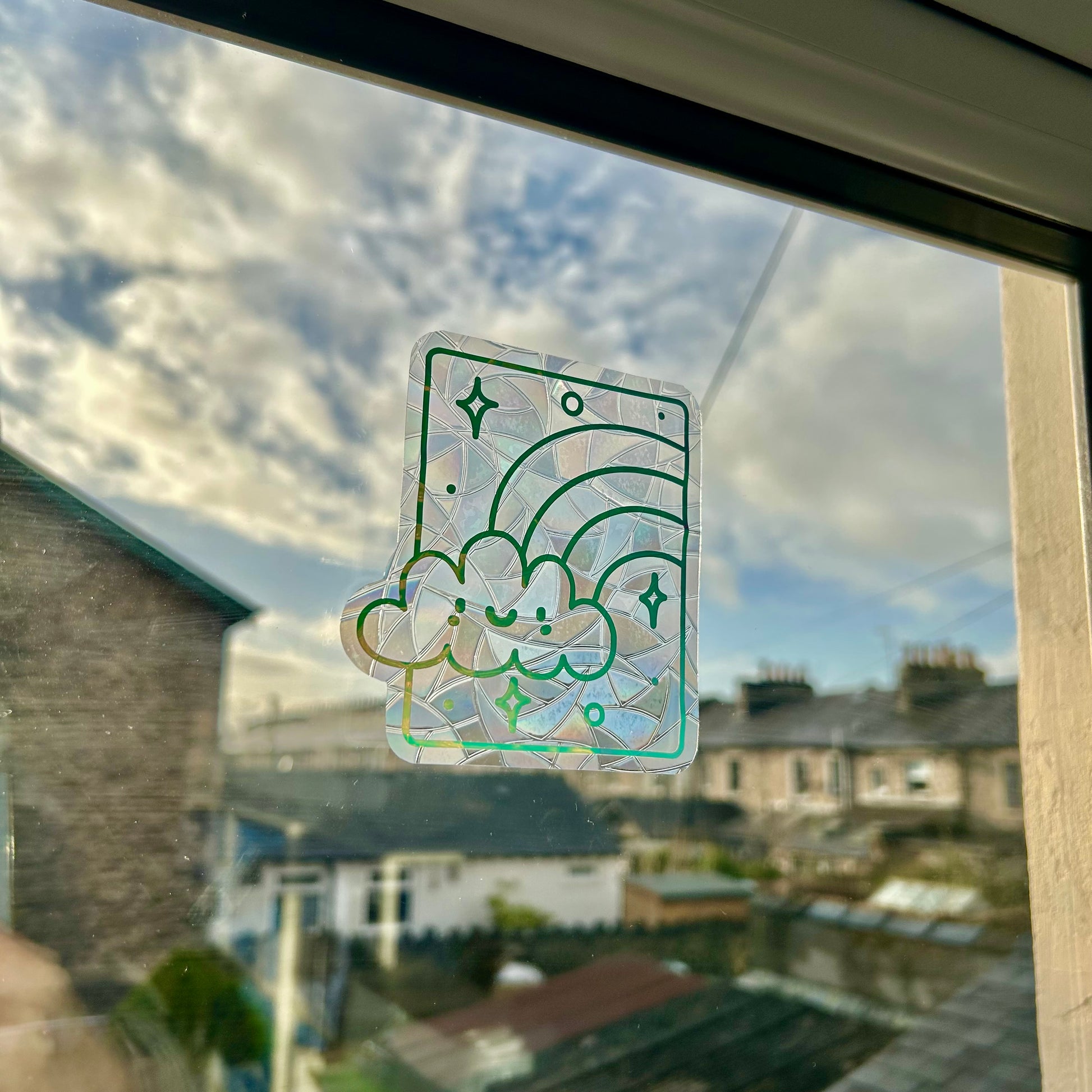 Each suncatcher has a holographic rainbow scene over the top of the background shape.