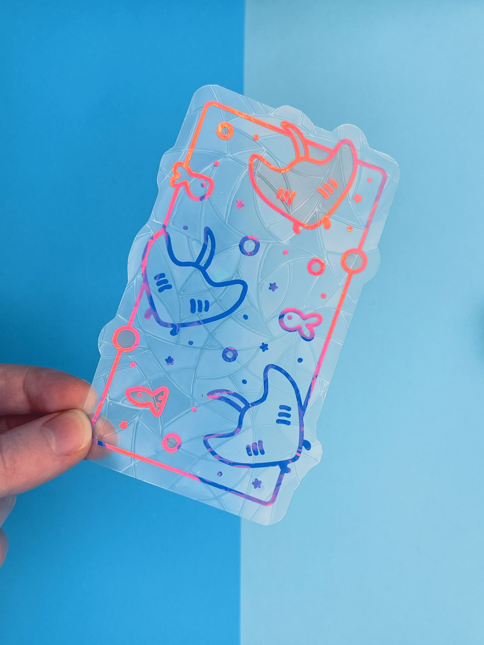 Each suncatcher has a holographic stingray scene over the top of the background shape.