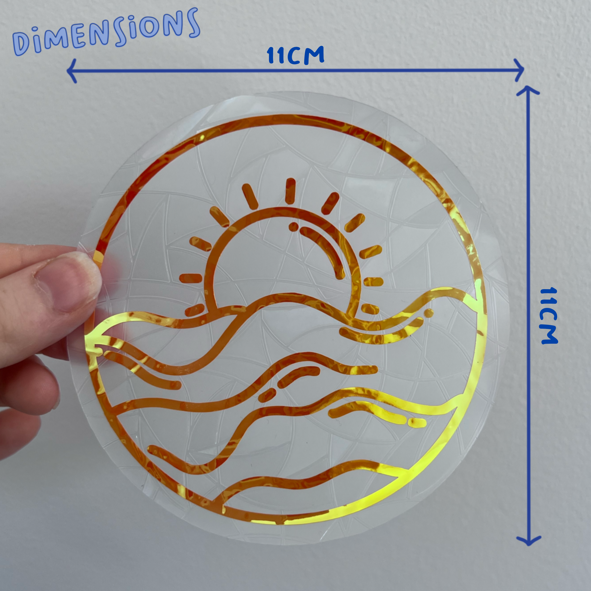 Each suncatcher has a holographic sunset scene over the top of the background shape.