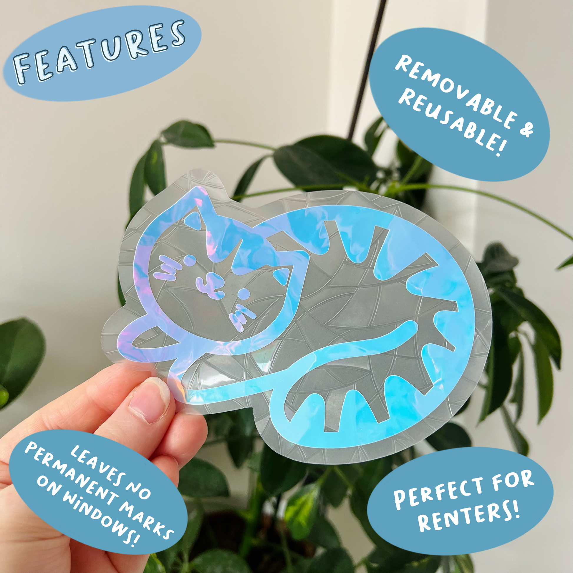 Each suncatcher has a holographic cat over the top of the background shape.