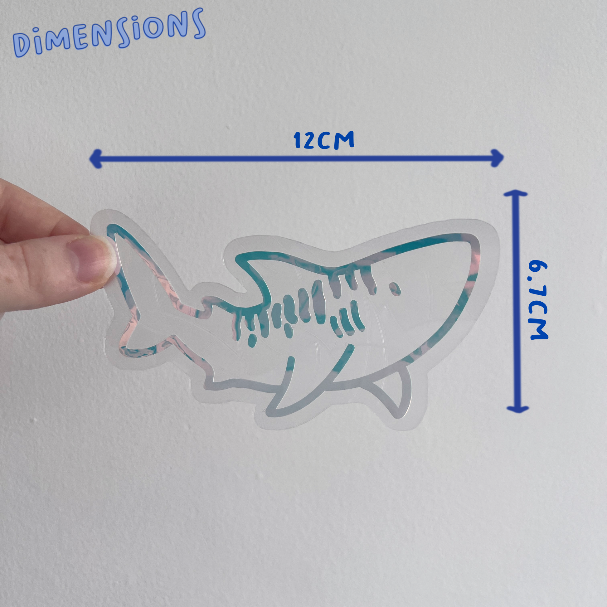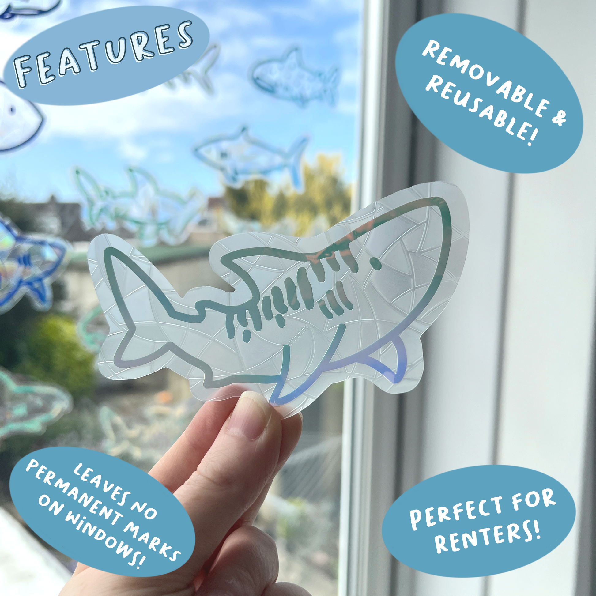 Each suncatcher has a holographic shark over the top of the background shape.