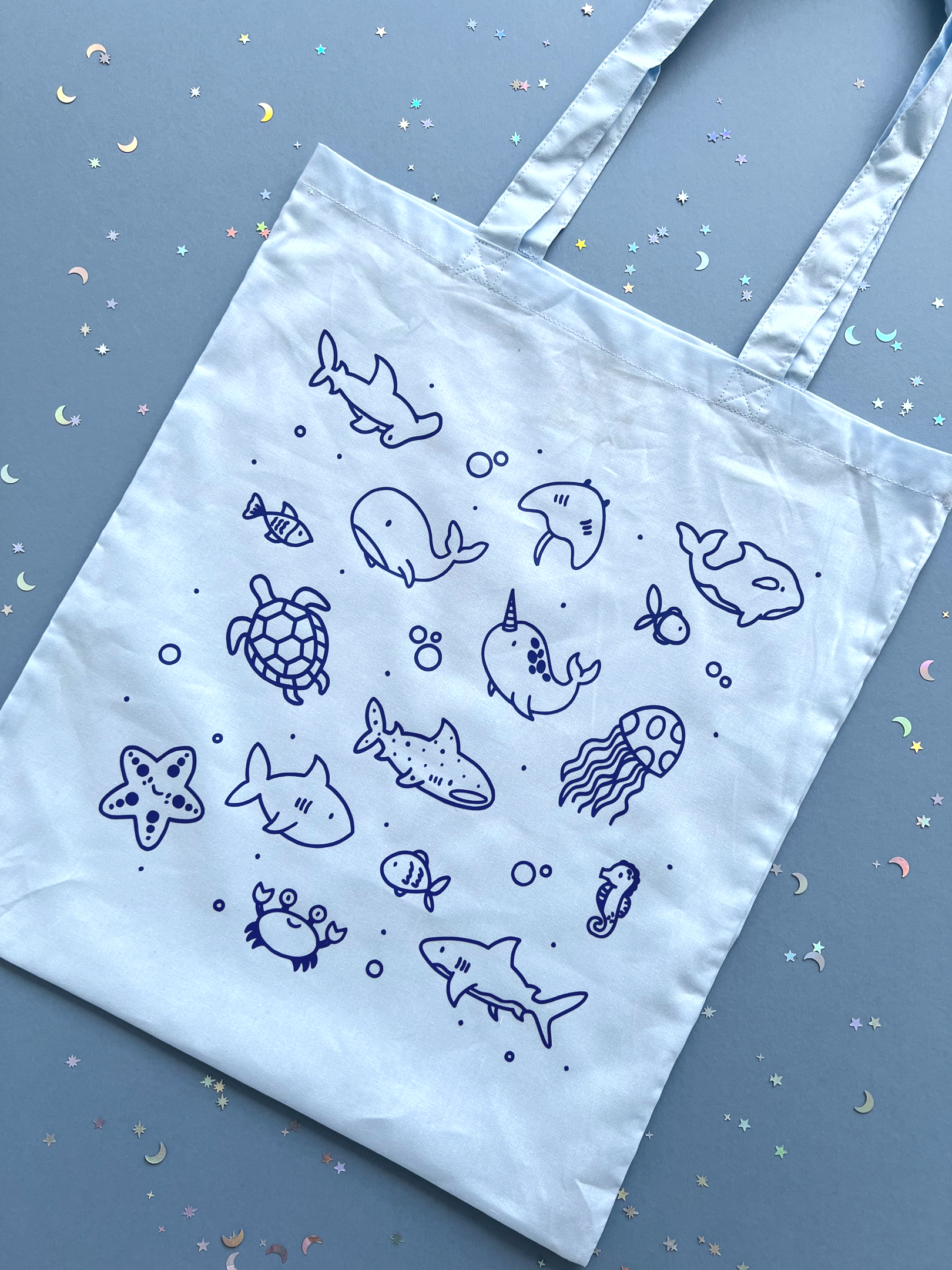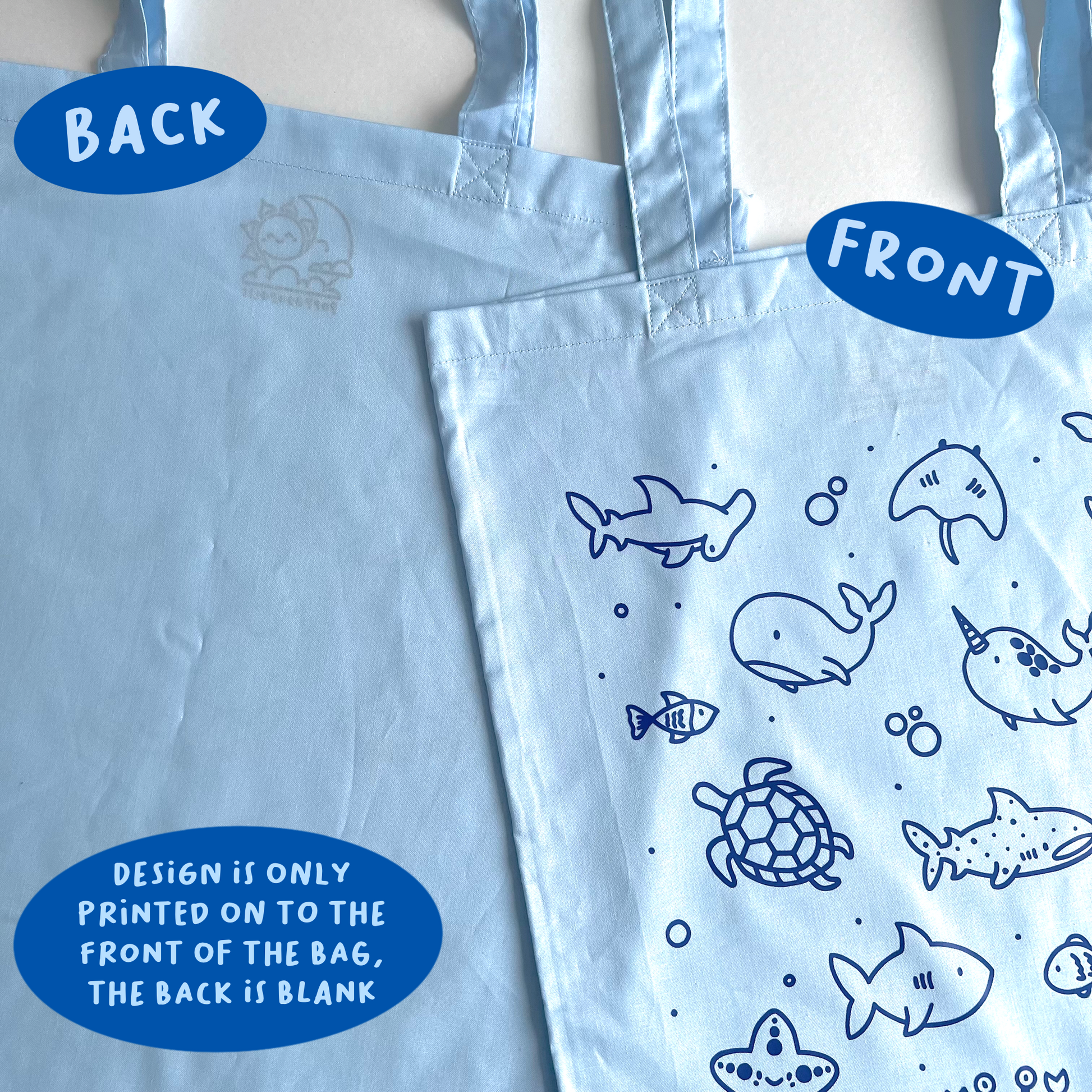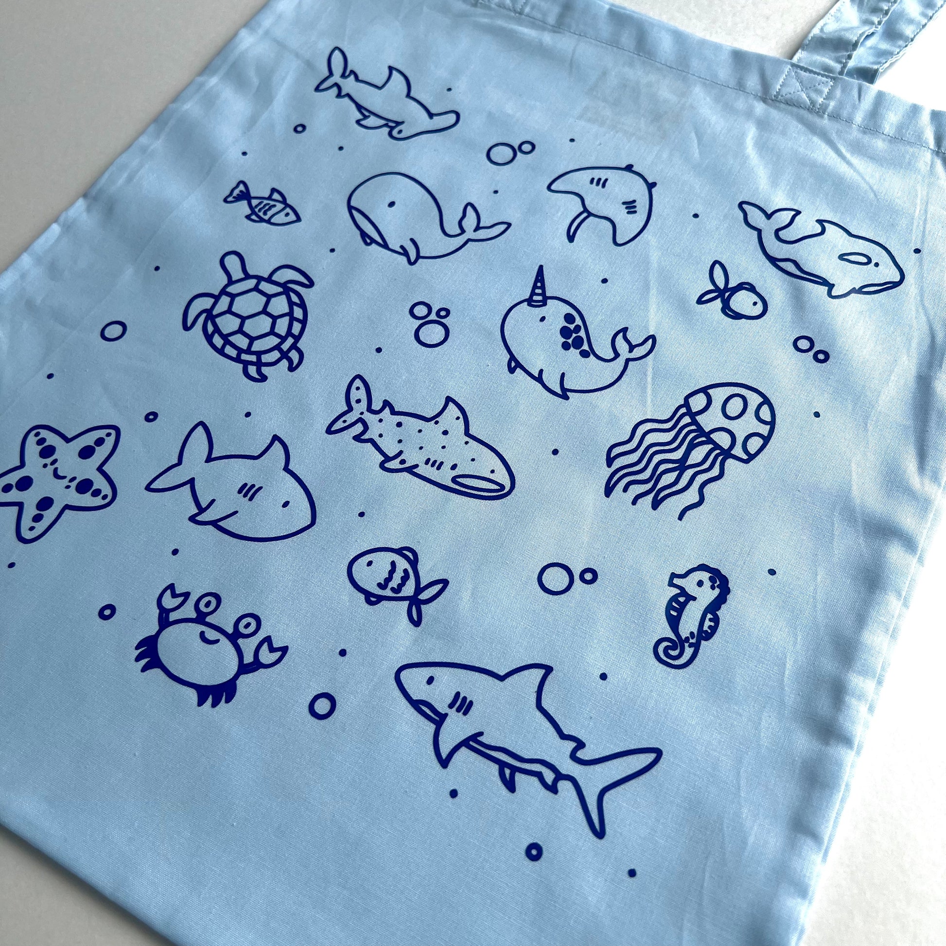 All tote bags are made from cotton with a blue vinyl sealife scene design over the top.