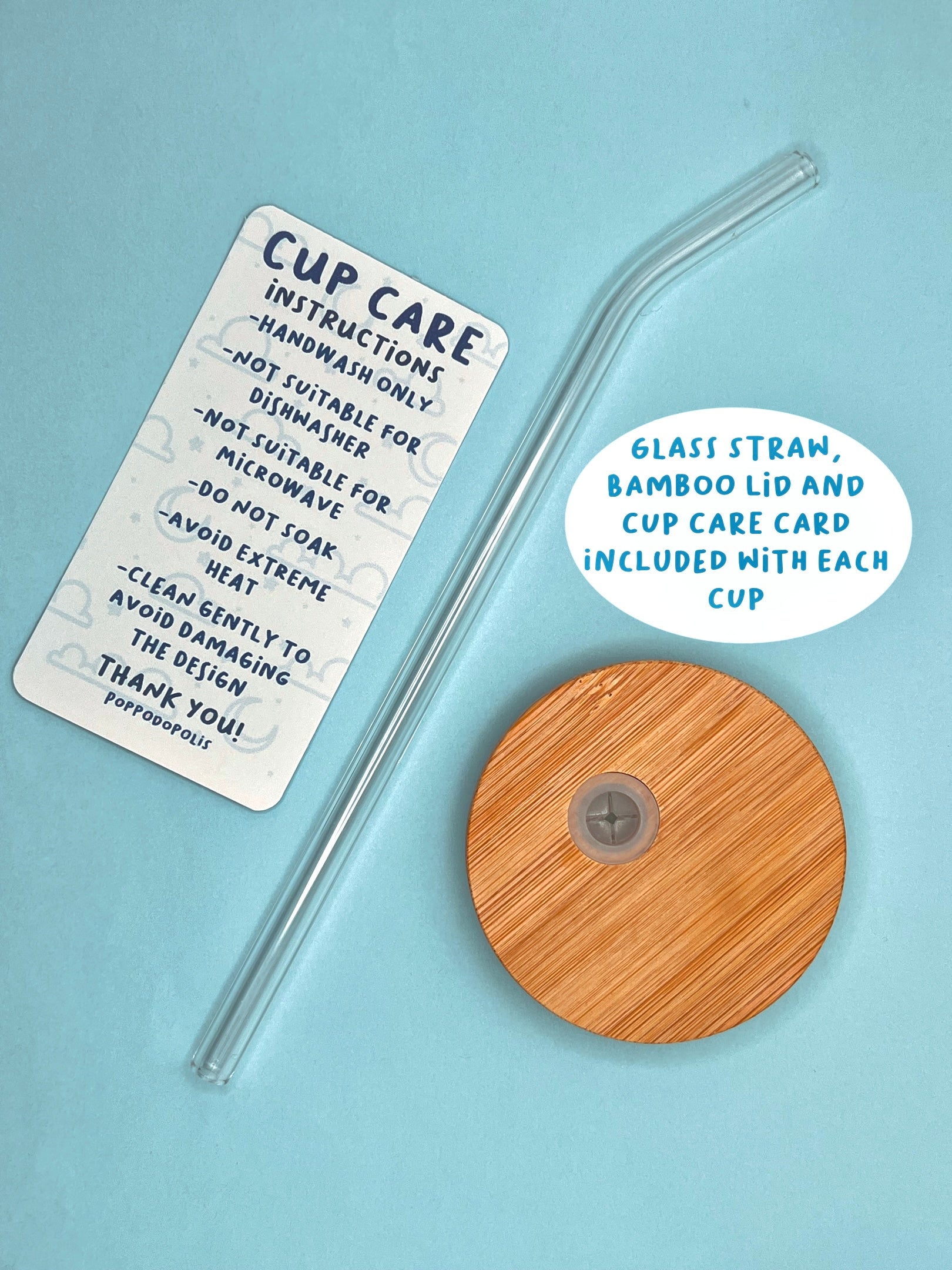 Each cup is made of high borosilicate glass and includes a bamboo lid and reusable glass straw. Each cup can hold up to 454ml (16oz) of liquid and is suitable for hot or cold drinks.