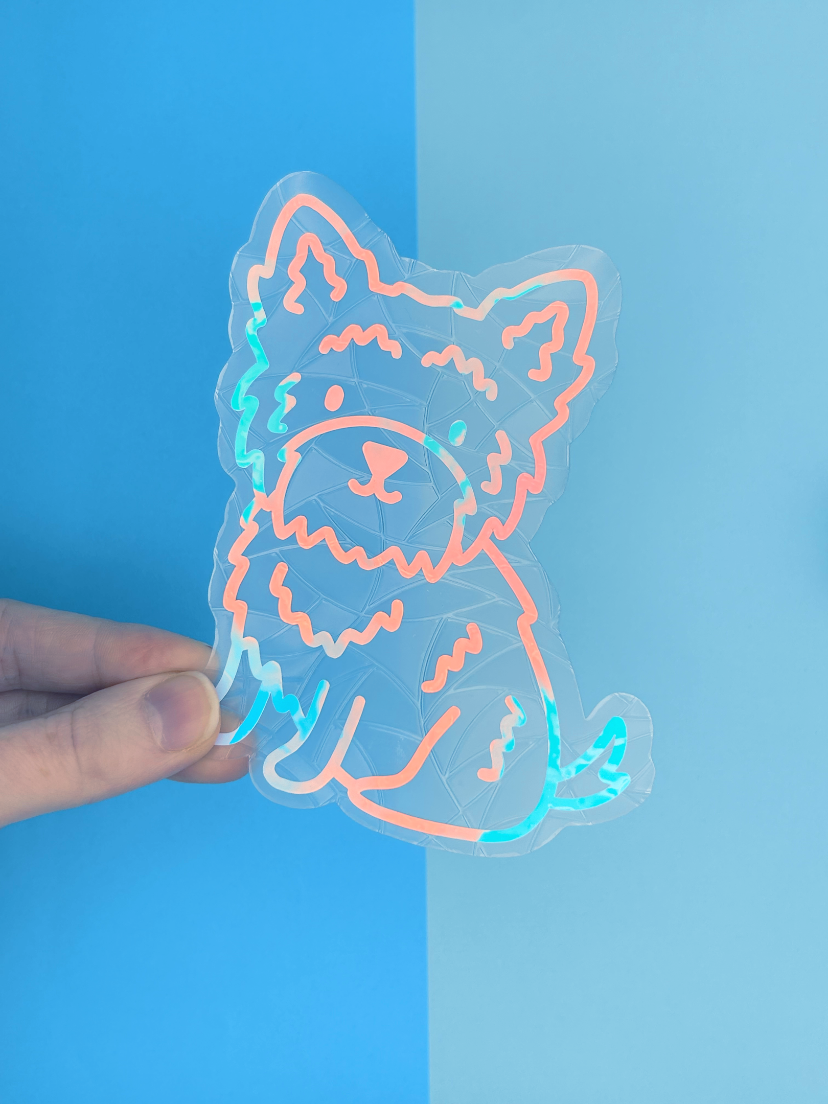 Each suncatcher has a holographic dog over the top of the background shape.