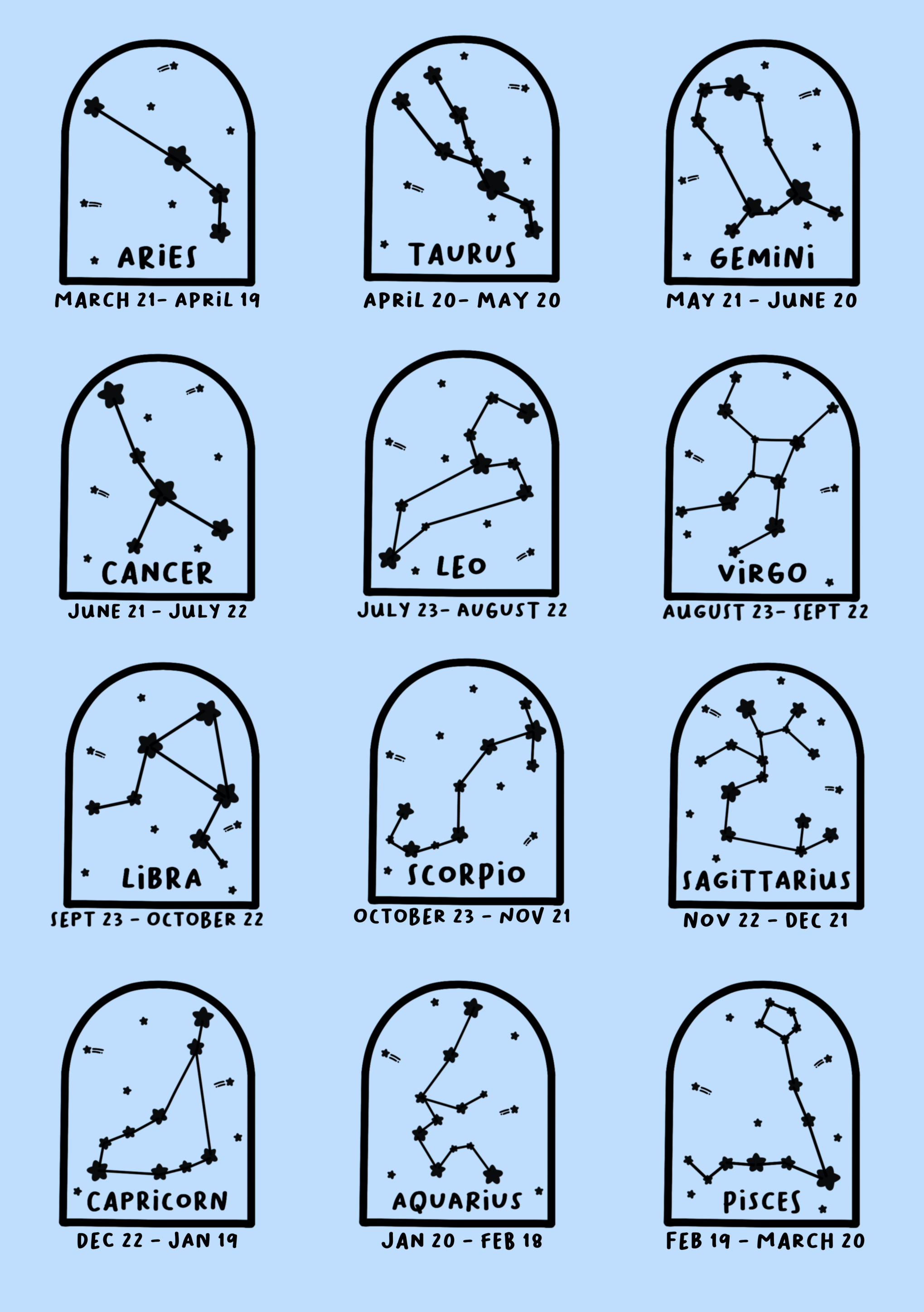 There are 12 designs to choose from based on each zodiac sign. See the photo below to determine which zodiac sign is yours if you are unsure.